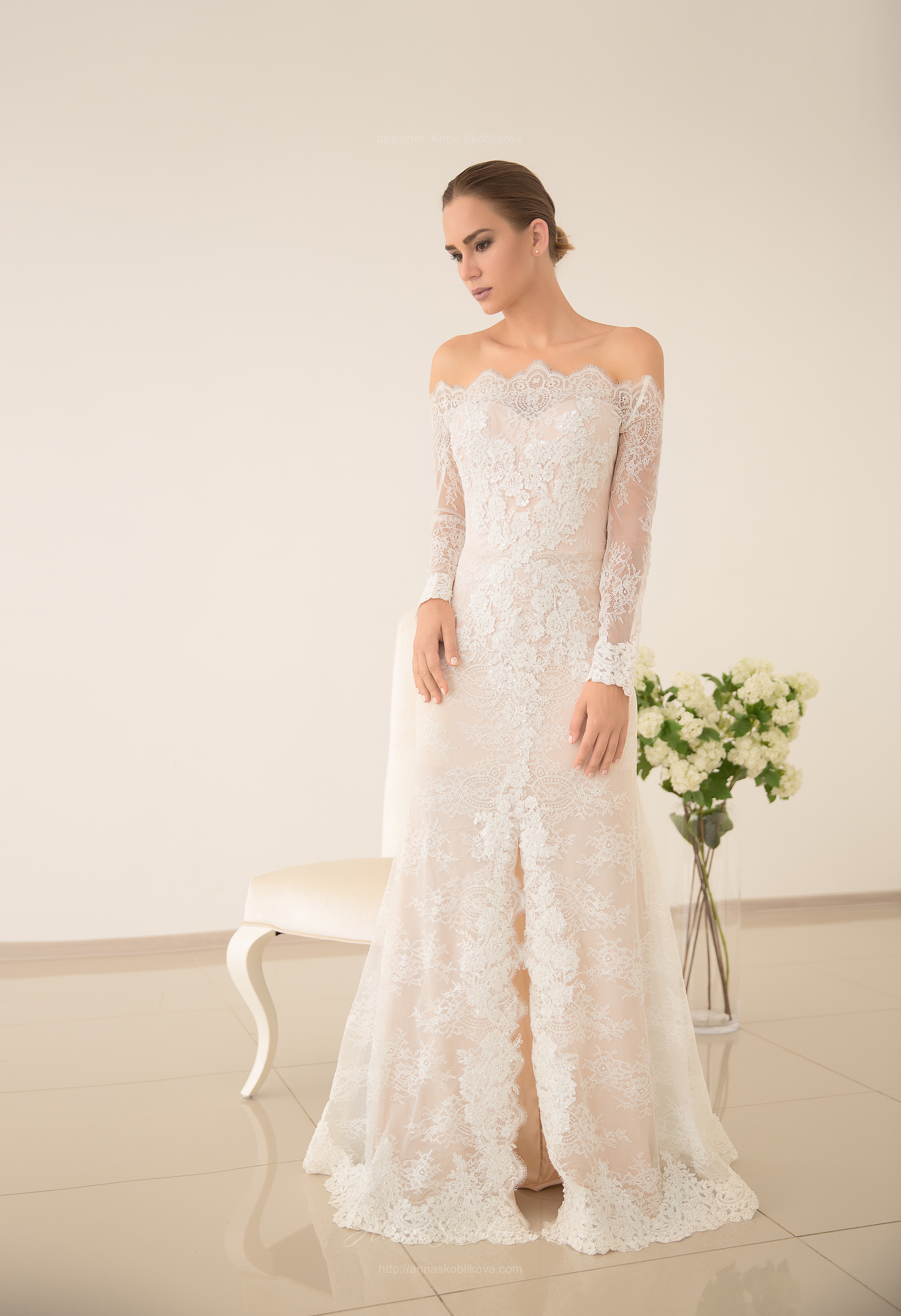 Акцентом платья являются открытые плечи и разрез на юбке которые густо вышиты вручную красивыми элементами кружева.