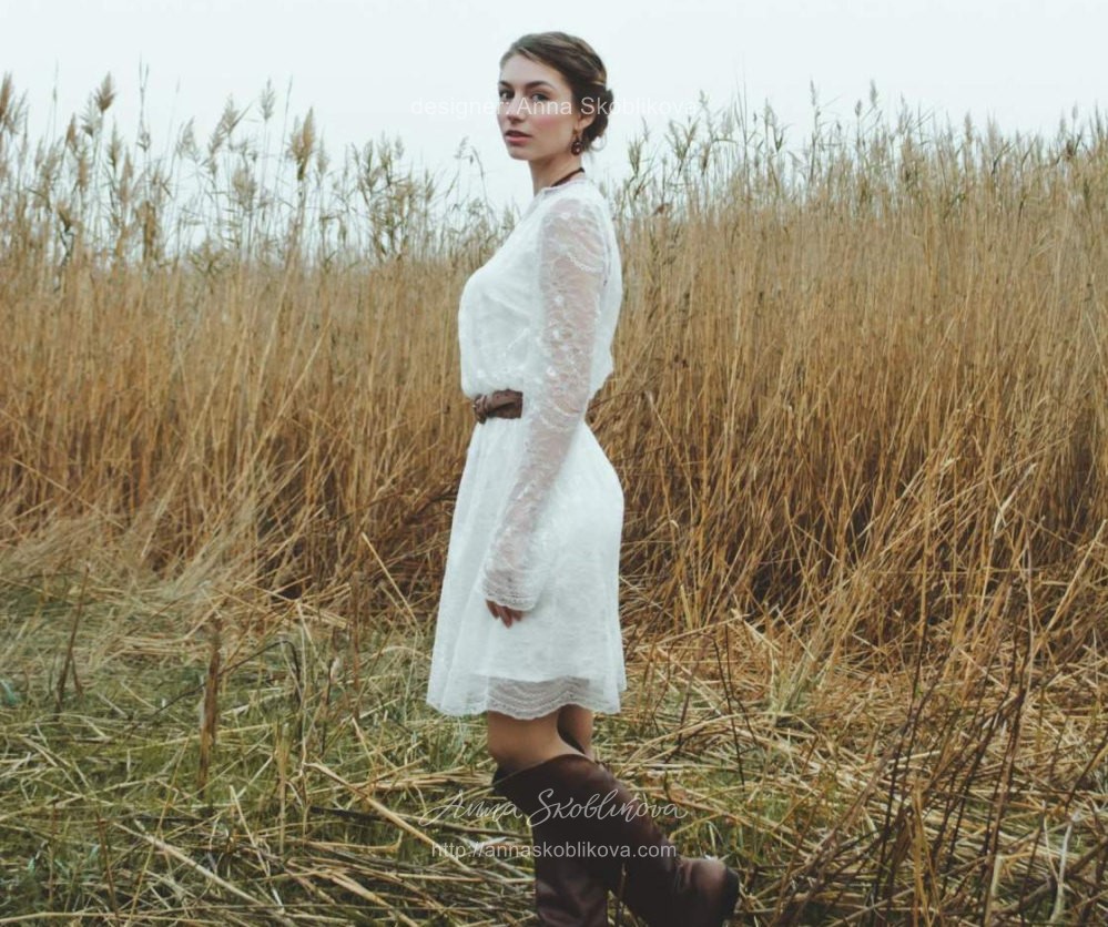 Короткое кружевное свадебное платье прямого кроя с длинным рукавом и круглым вырезом.