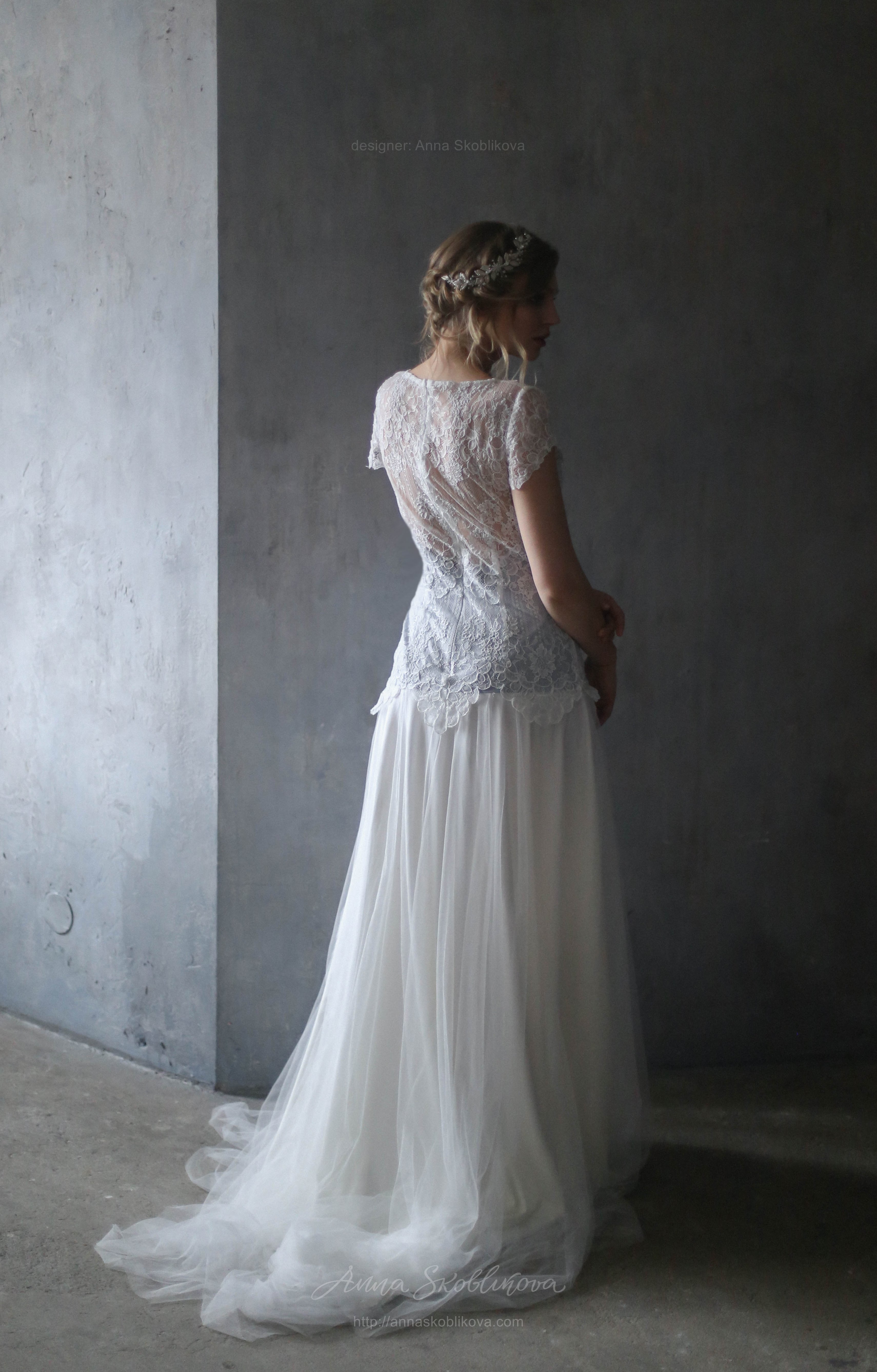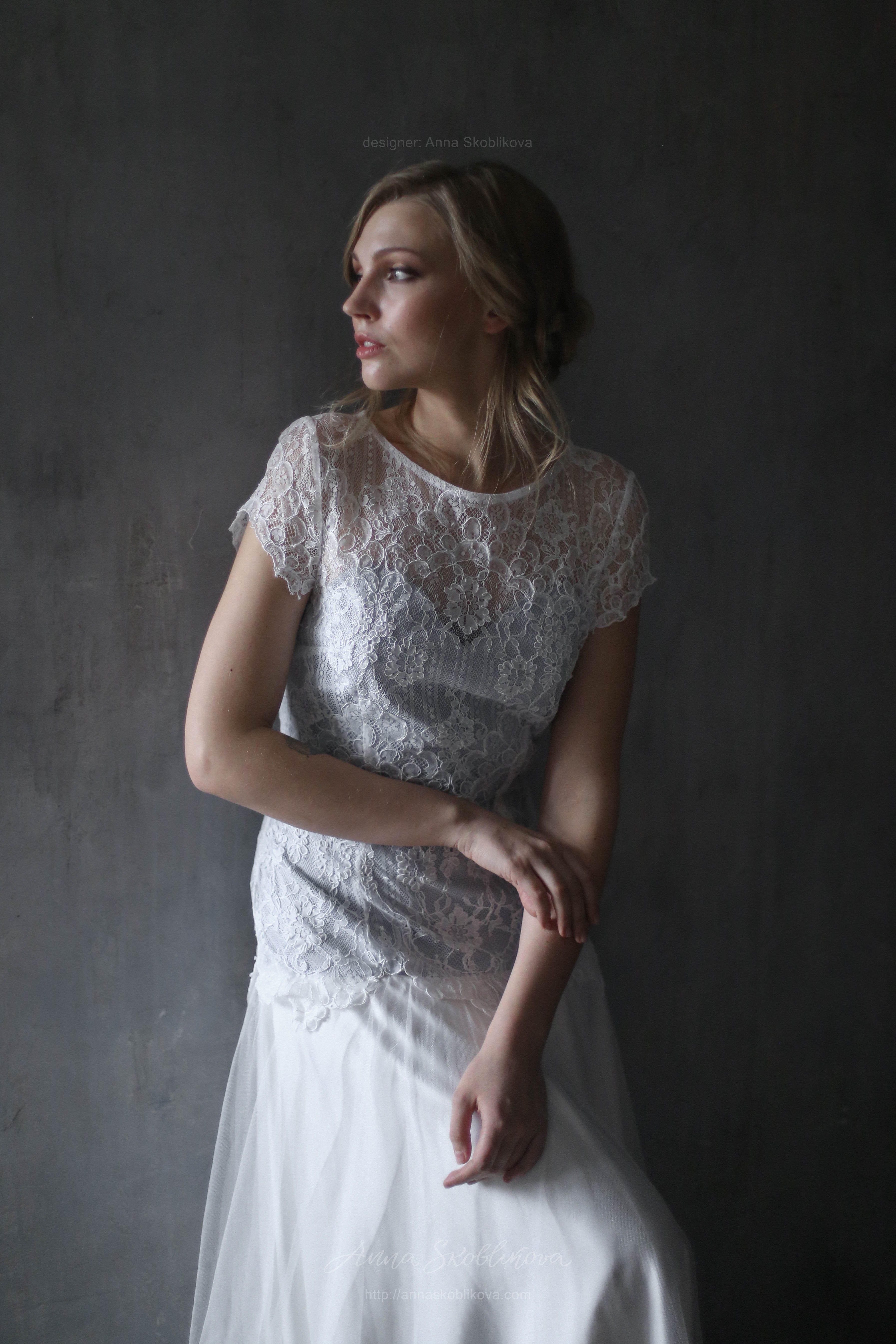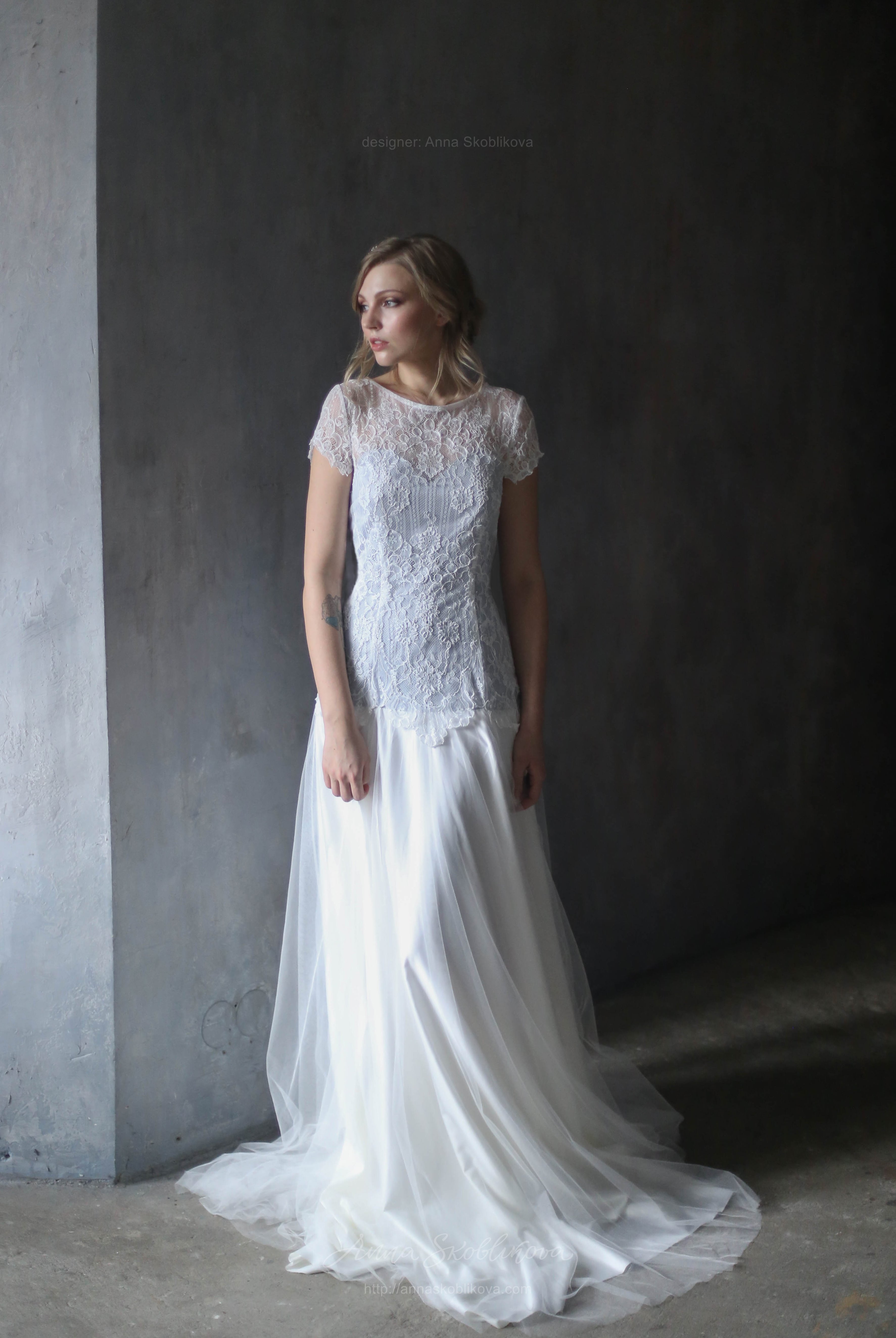 Нежное свадебное платье с кружевом переходящим на бедра. Подкладка под кружевом серо-голубого цвета. Юбка выполнена из стрейч-сатина и тоненькой итальянской сеточки. Рукав укороченный.