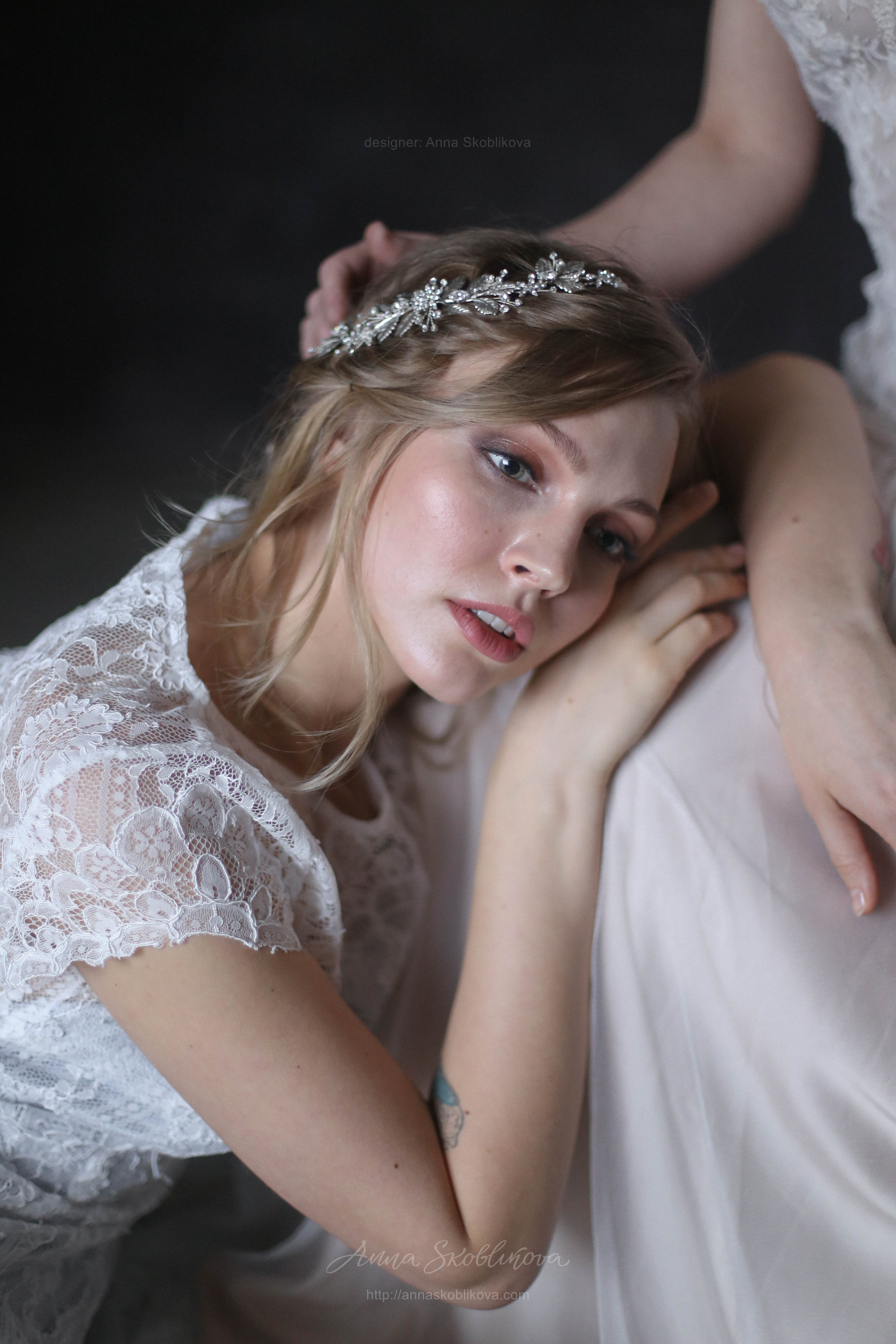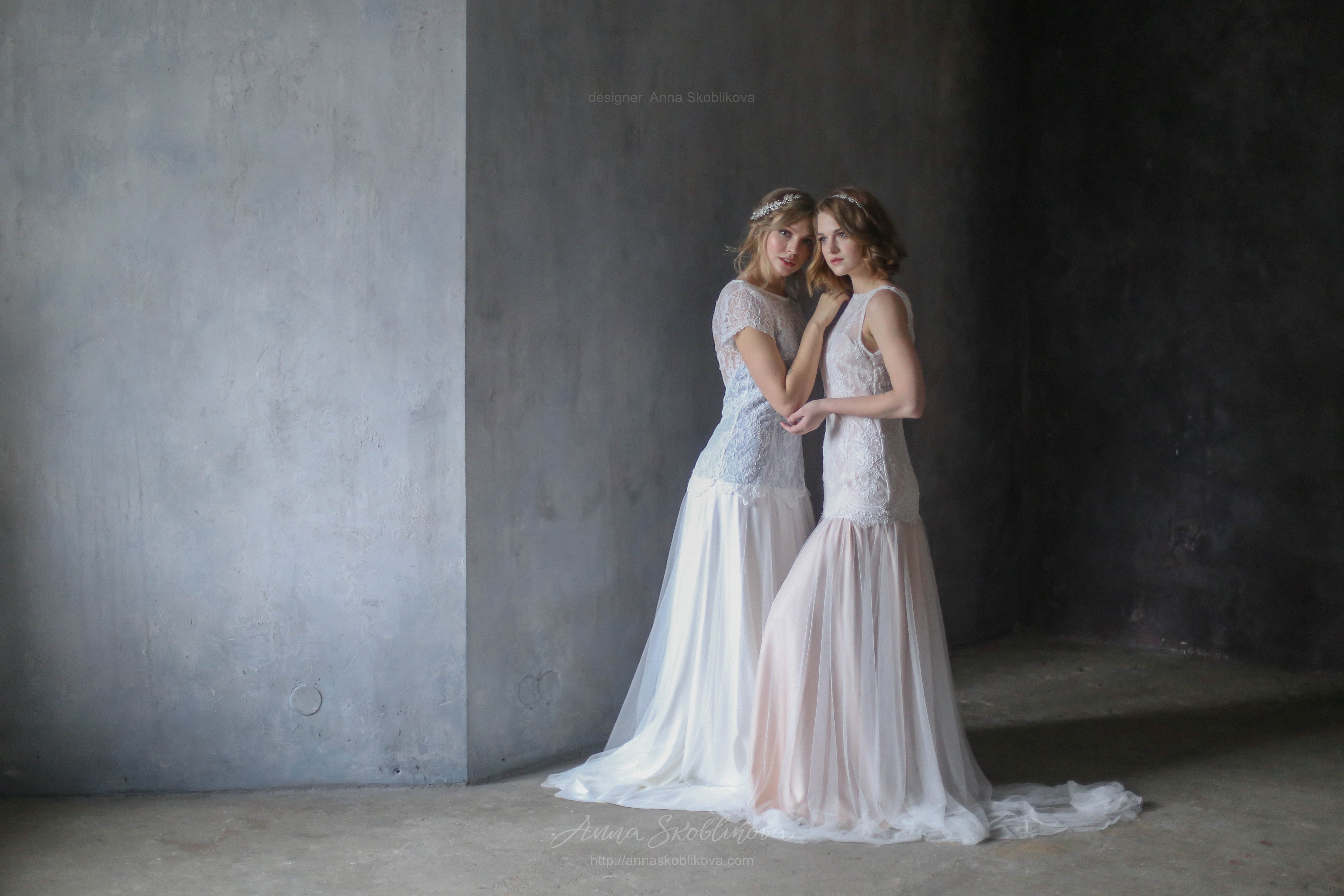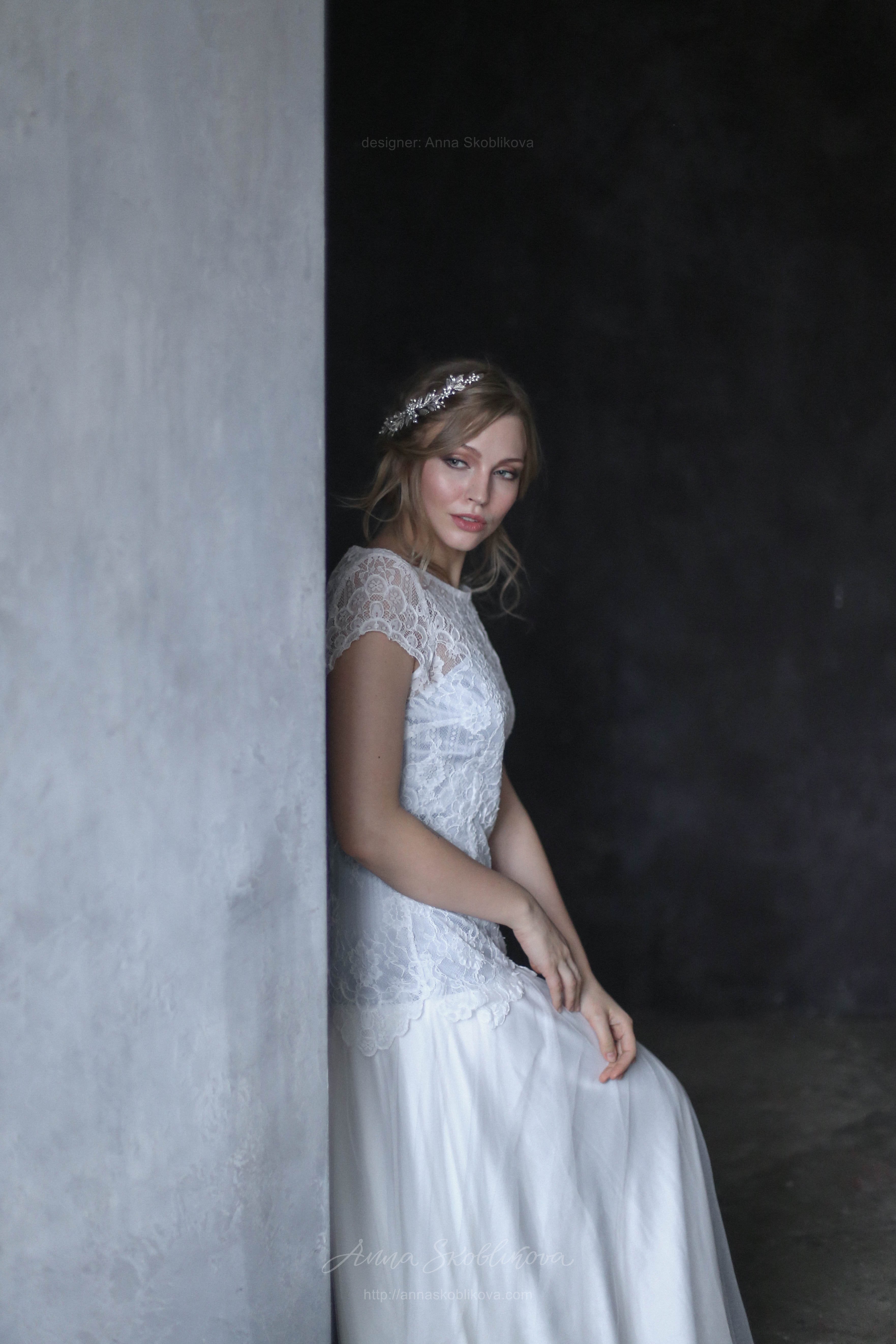 Нежное свадебное платье с кружевом переходящим на бедра. Подкладка под кружевом серо-голубого цвета. Юбка выполнена из стрейч-сатина и тоненькой итальянской сеточки. Рукав укороченный.