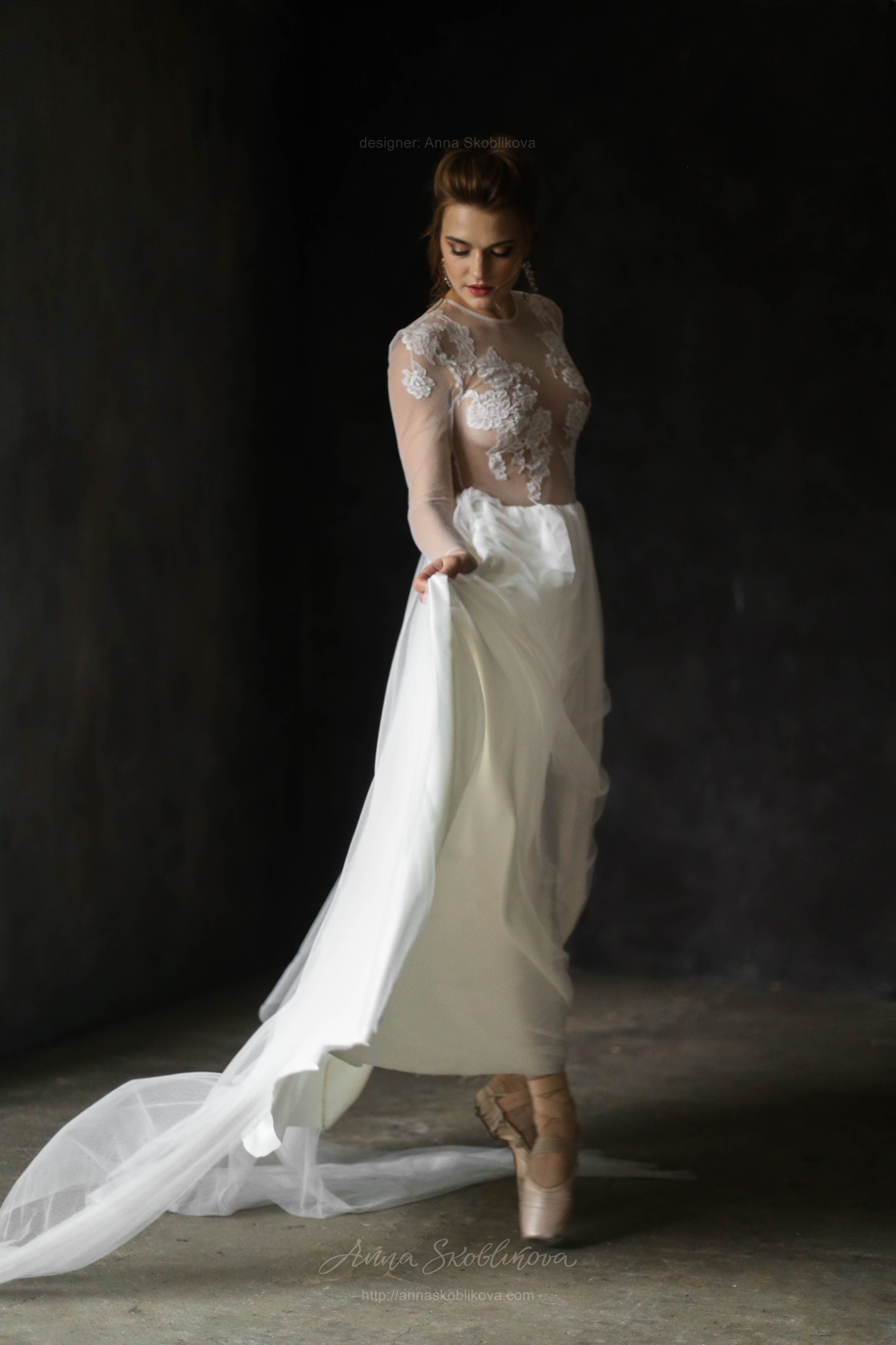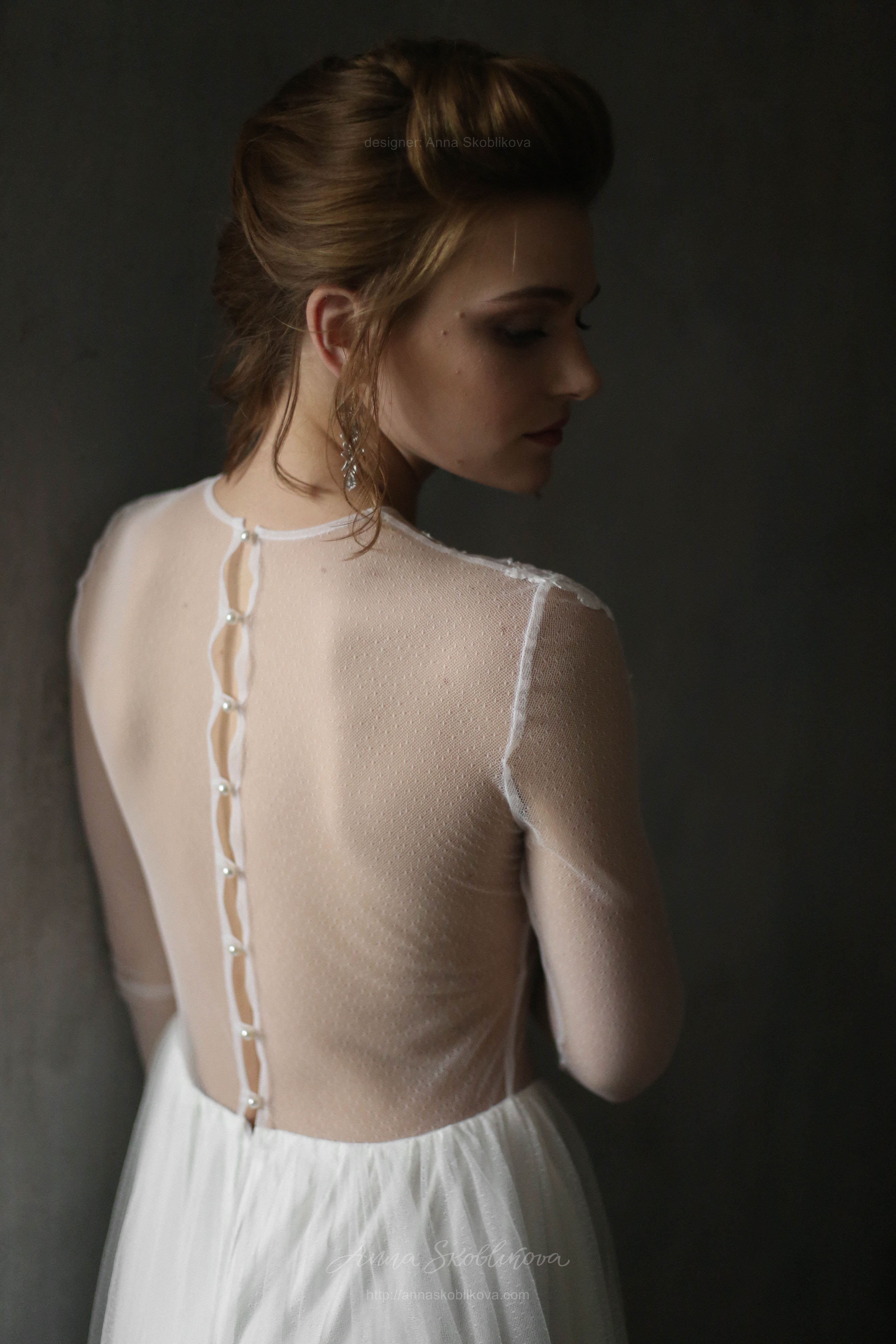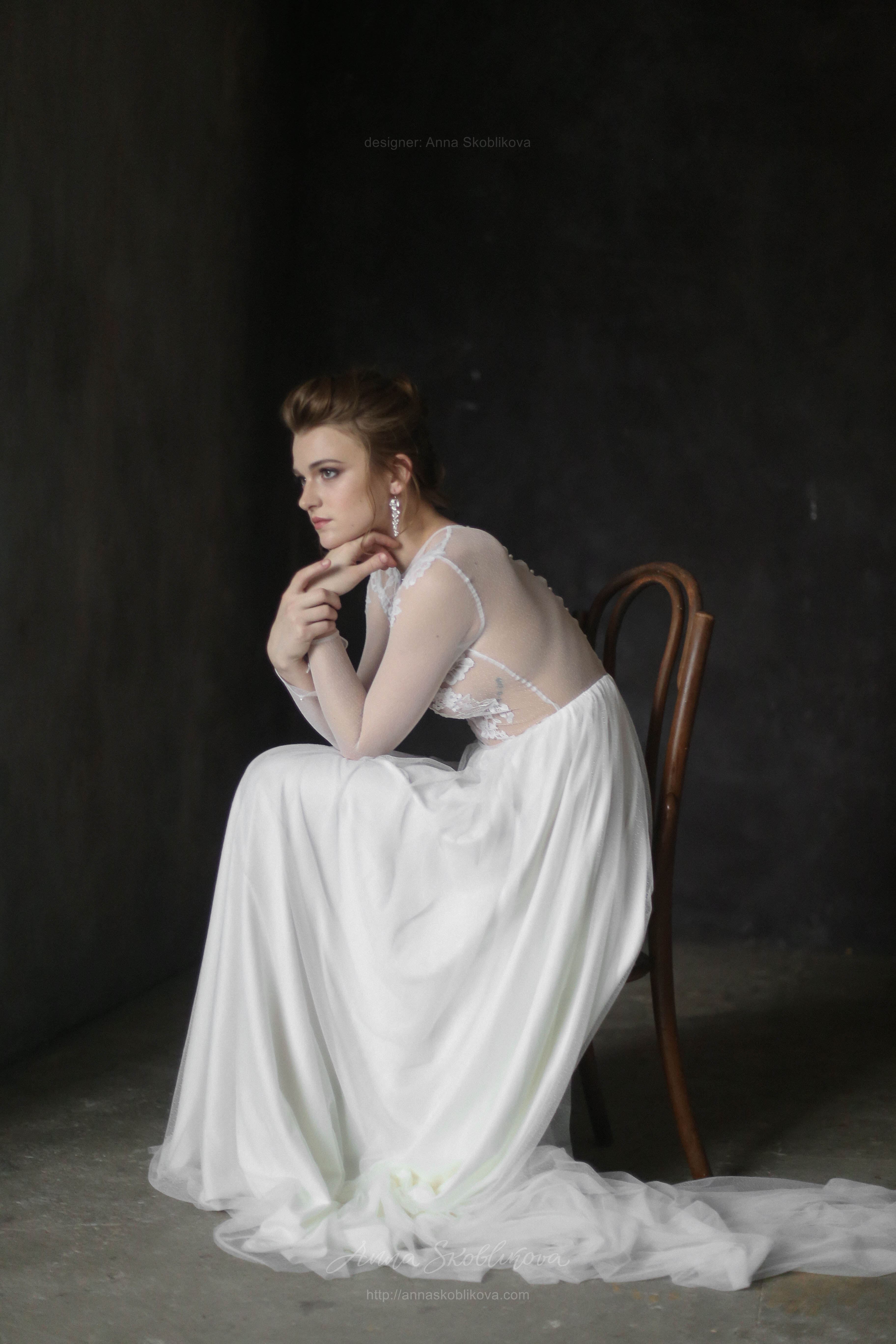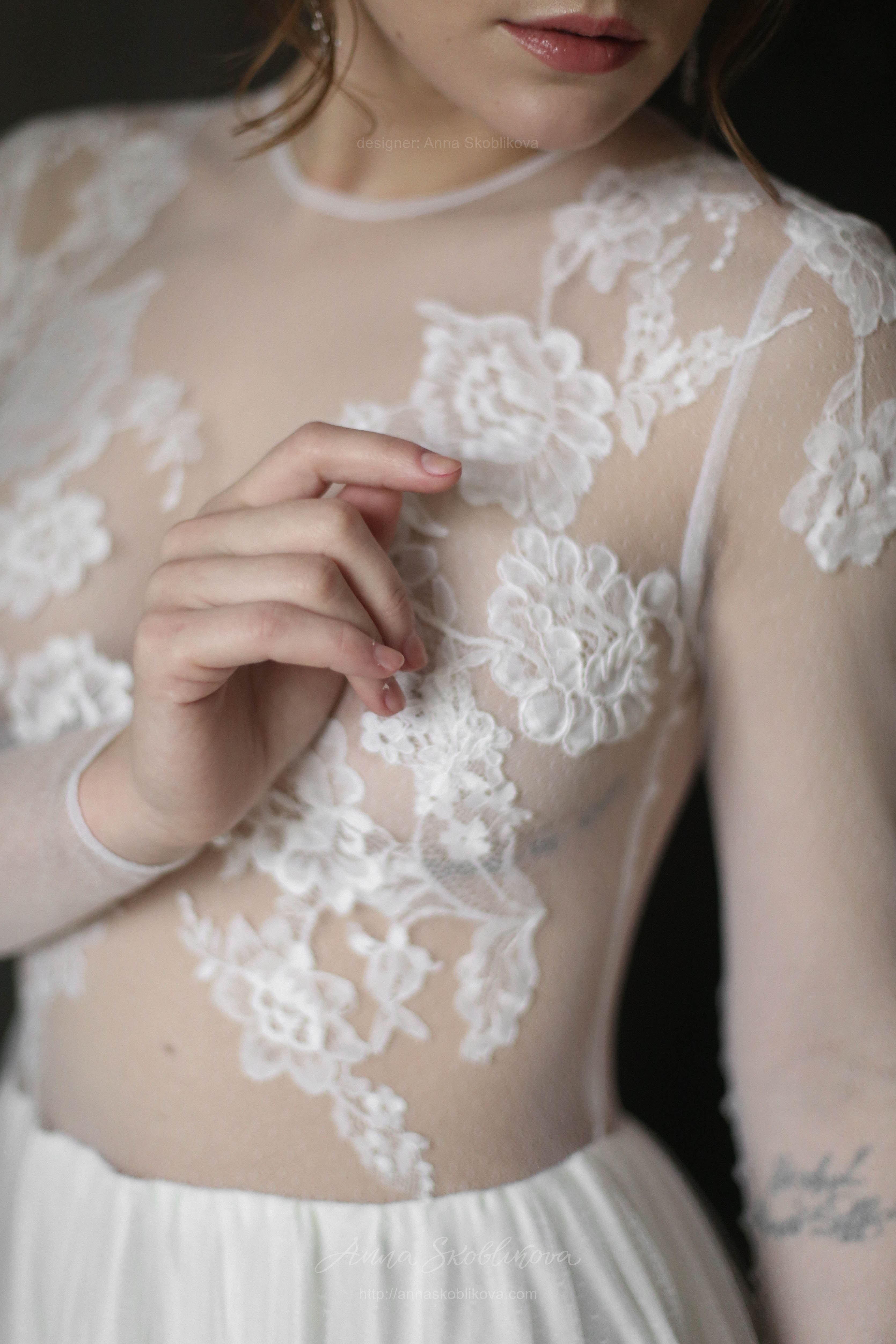 Нежное платье из европейской сетки и шелка. Лиф из тоненькой фактурной сетки вышит полностью вручную французским кружевом. Юбка имеет небольшой шлейф. К платью вы можете заказать пояс ручной работы с вышивкой или винтажной застежкой