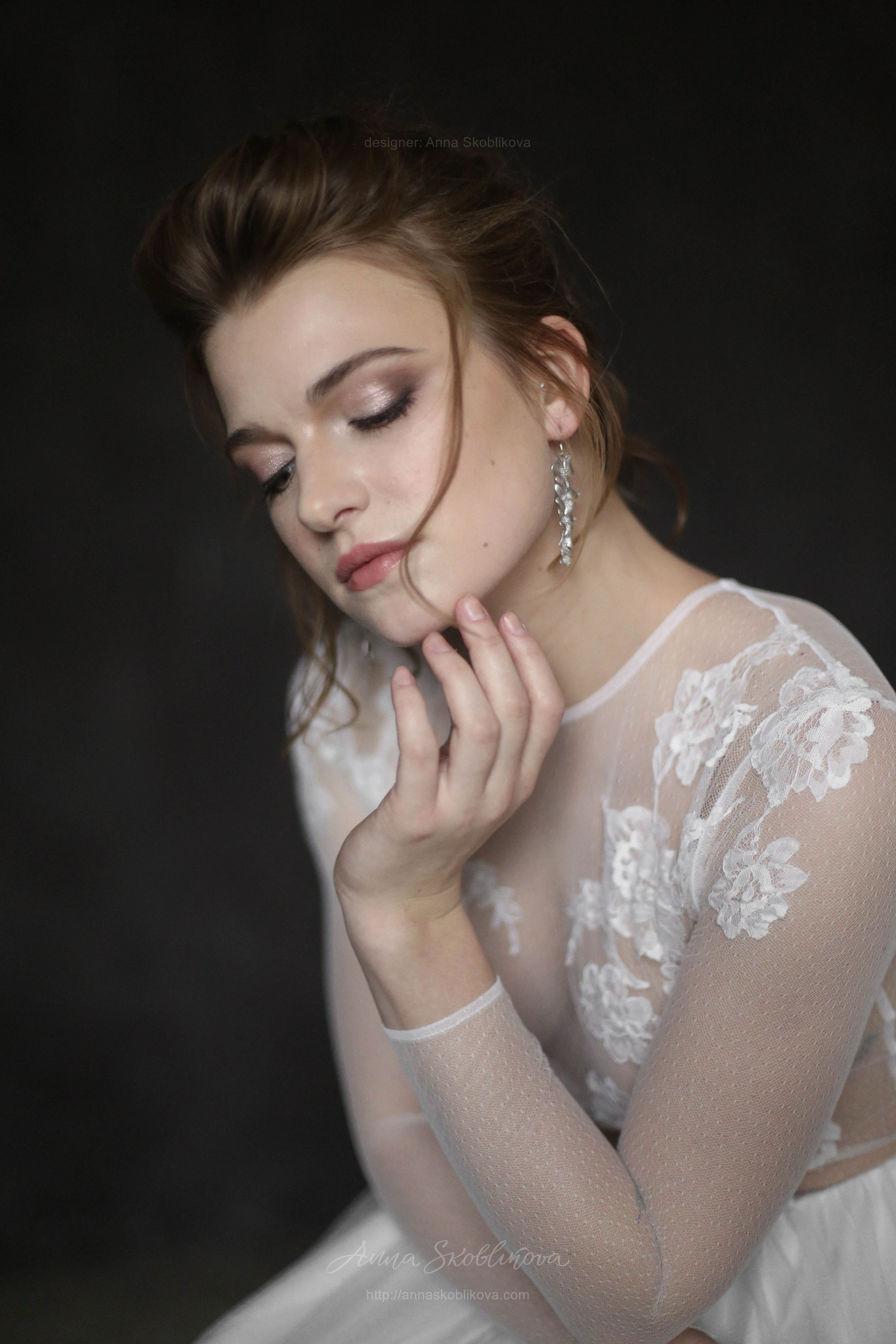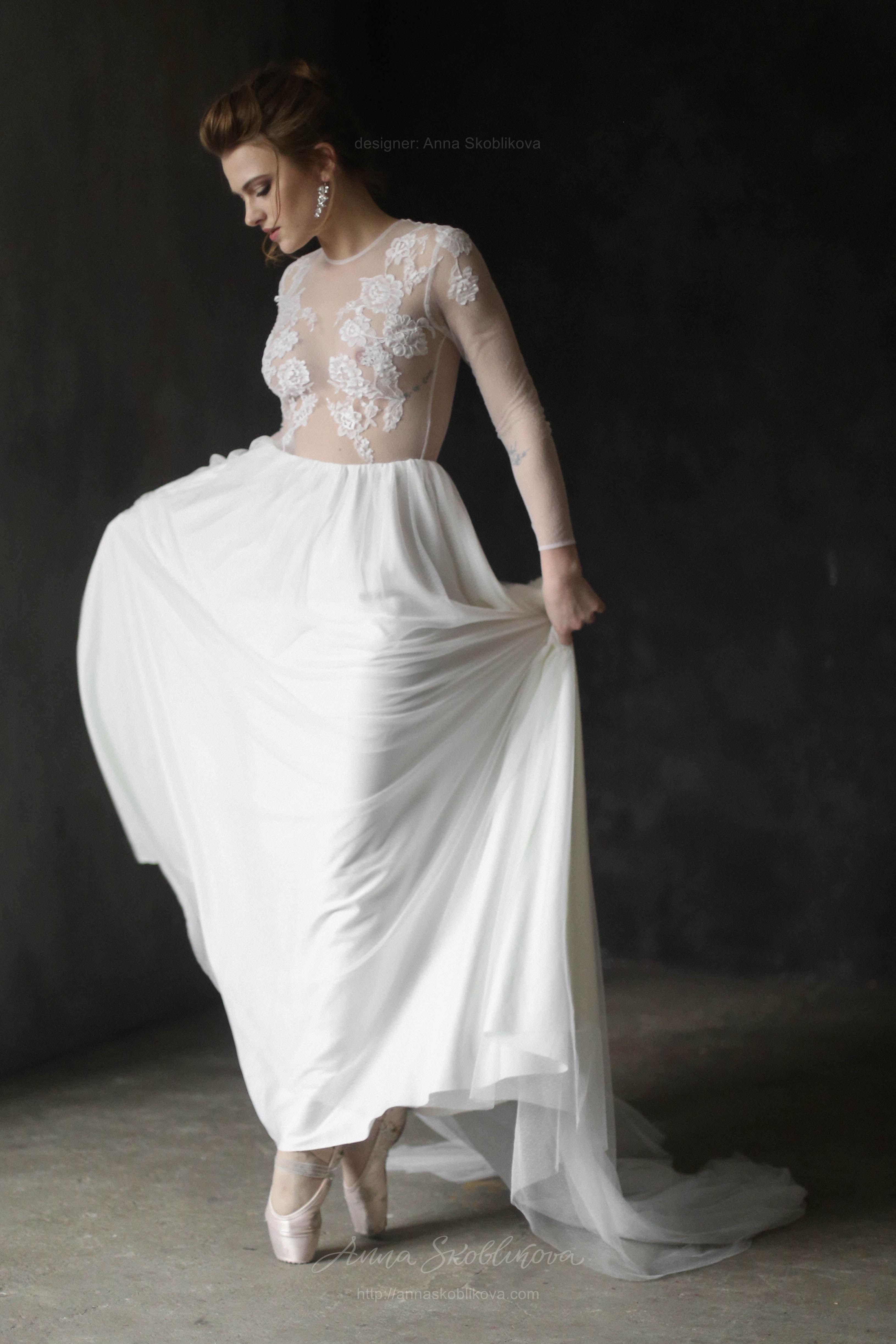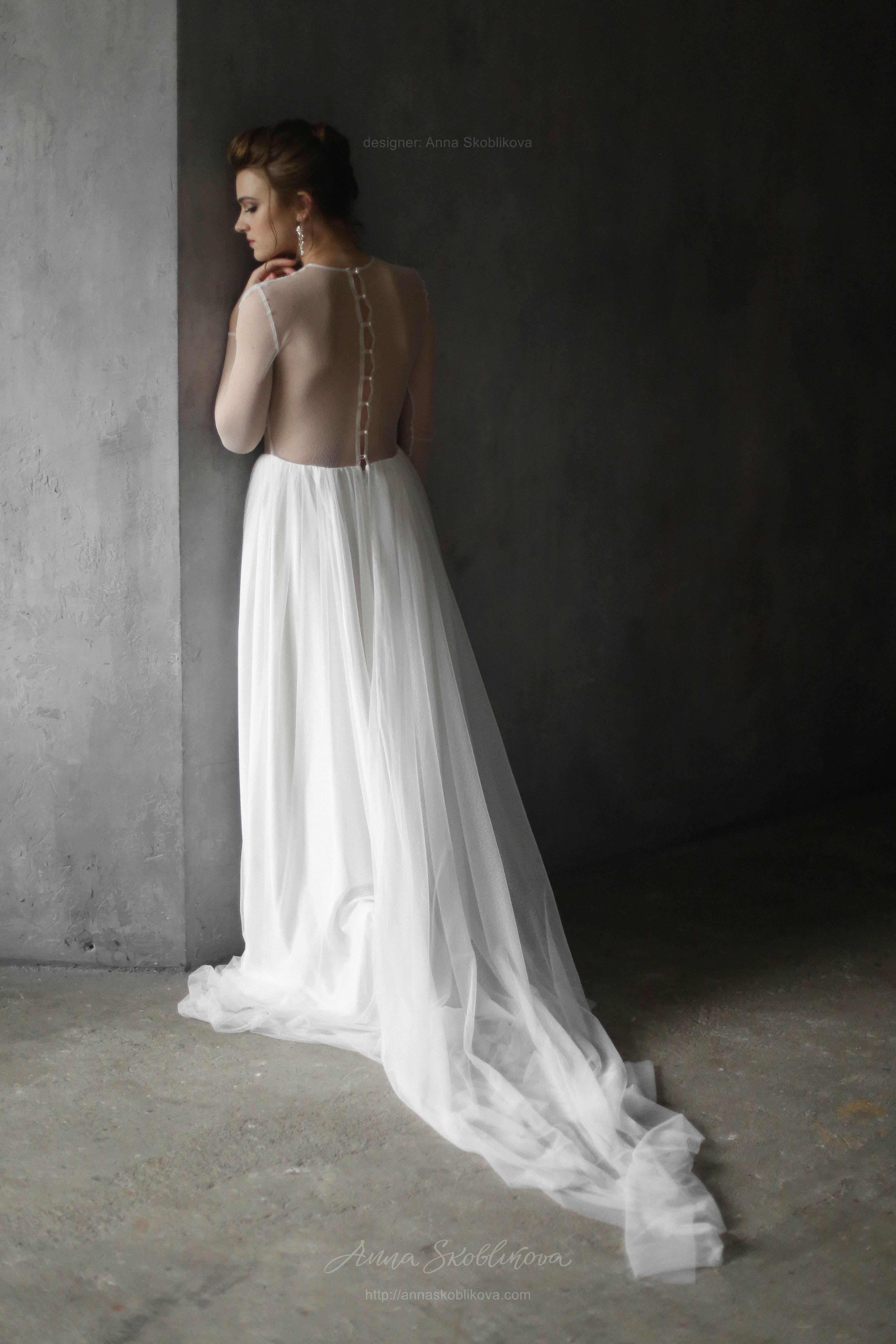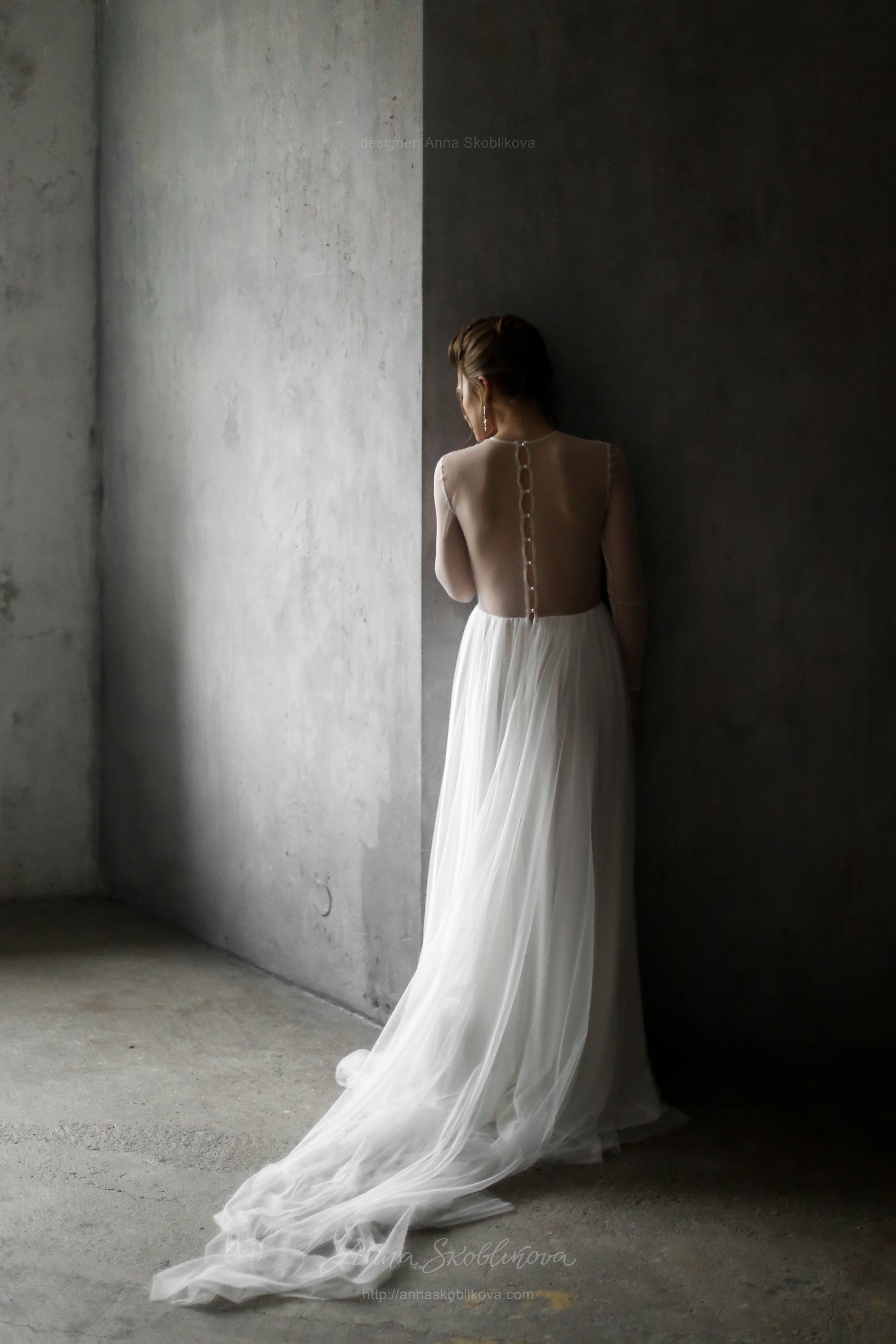 Нежное платье из европейской сетки и шелка. Лиф из тоненькой фактурной сетки вышит полностью вручную французским кружевом. Юбка имеет небольшой шлейф. К платью вы можете заказать пояс ручной работы с вышивкой или винтажной застежкой