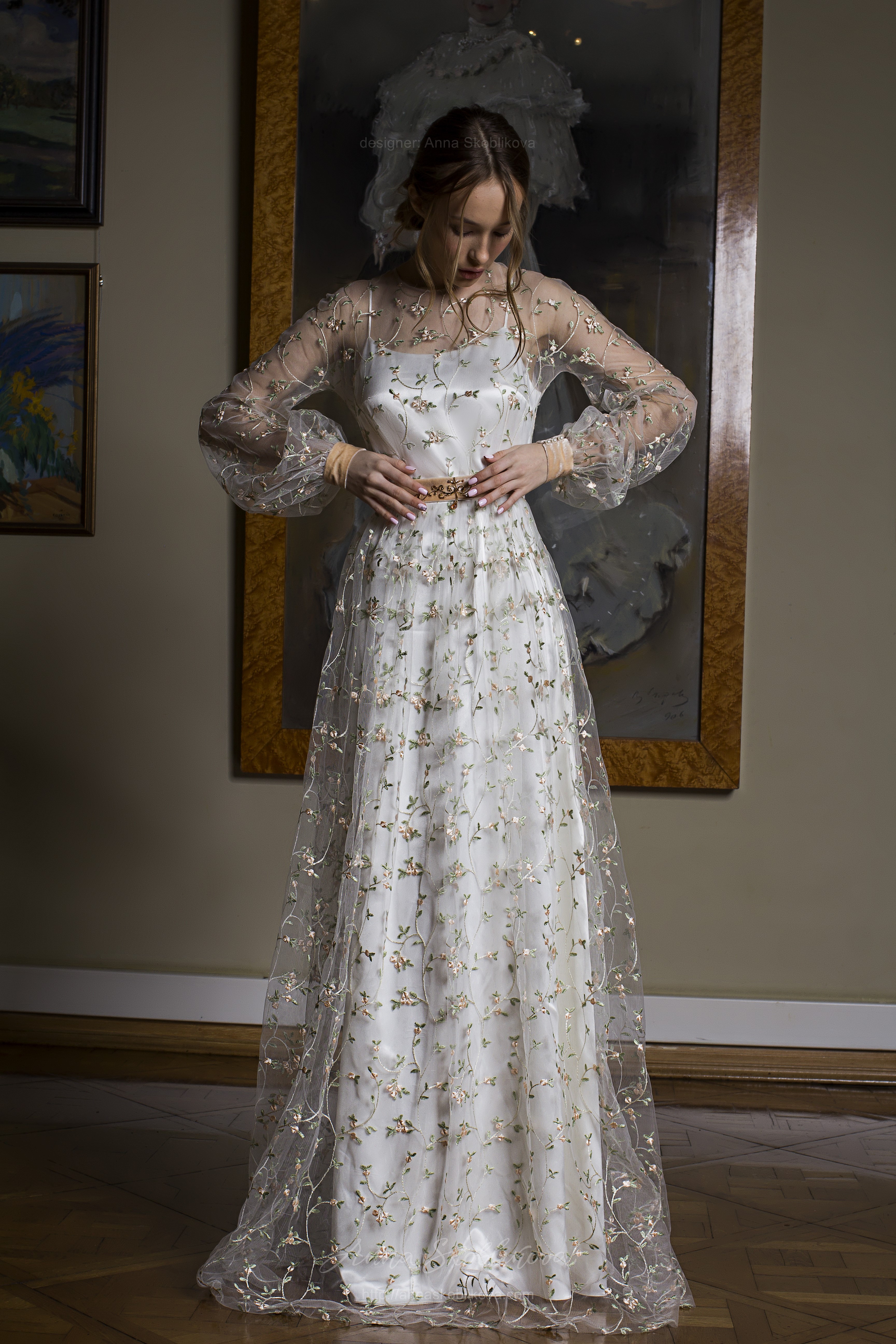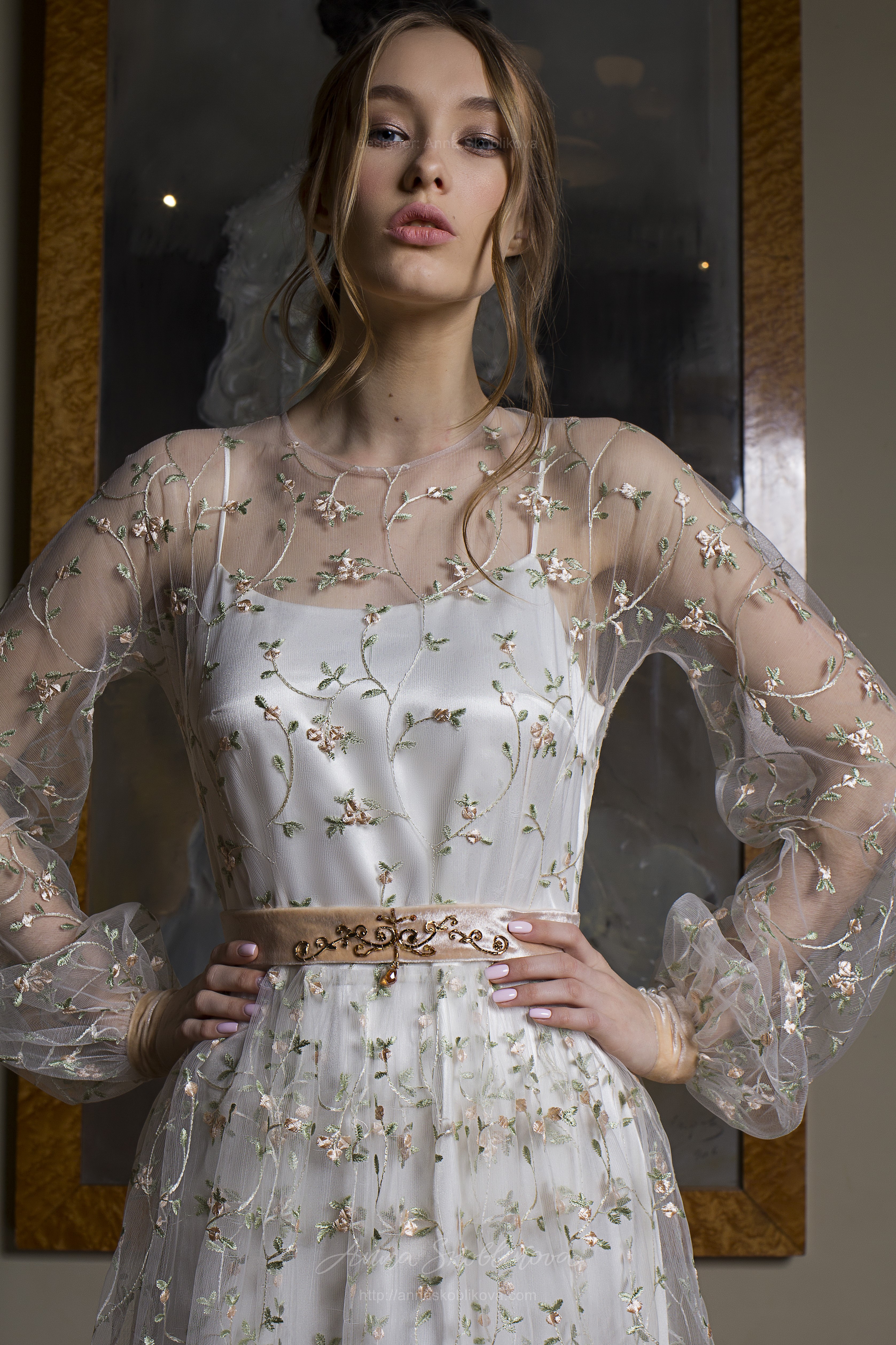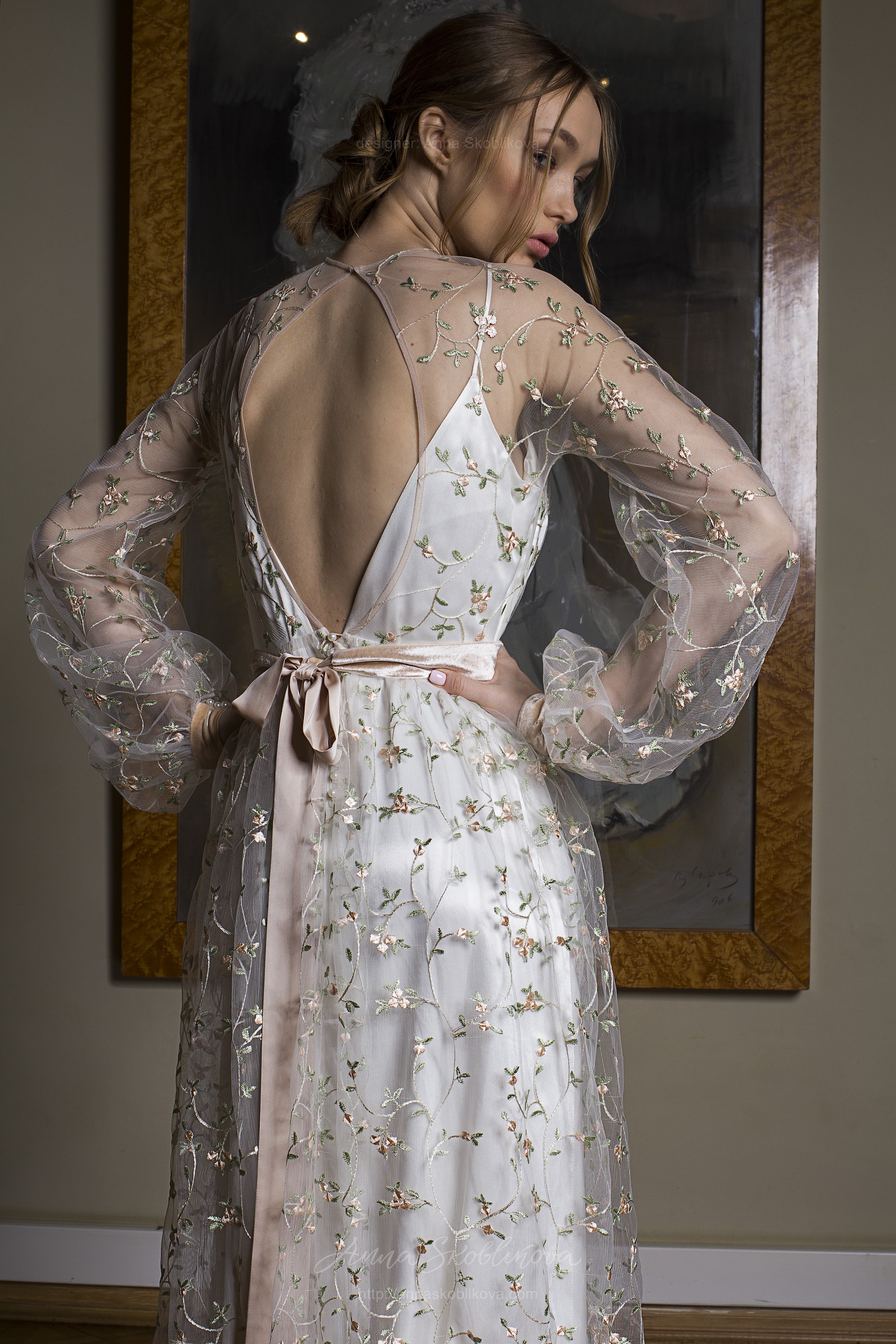Верхнее прозрачное платье выполнено из вышитой сетки молочного цвета.