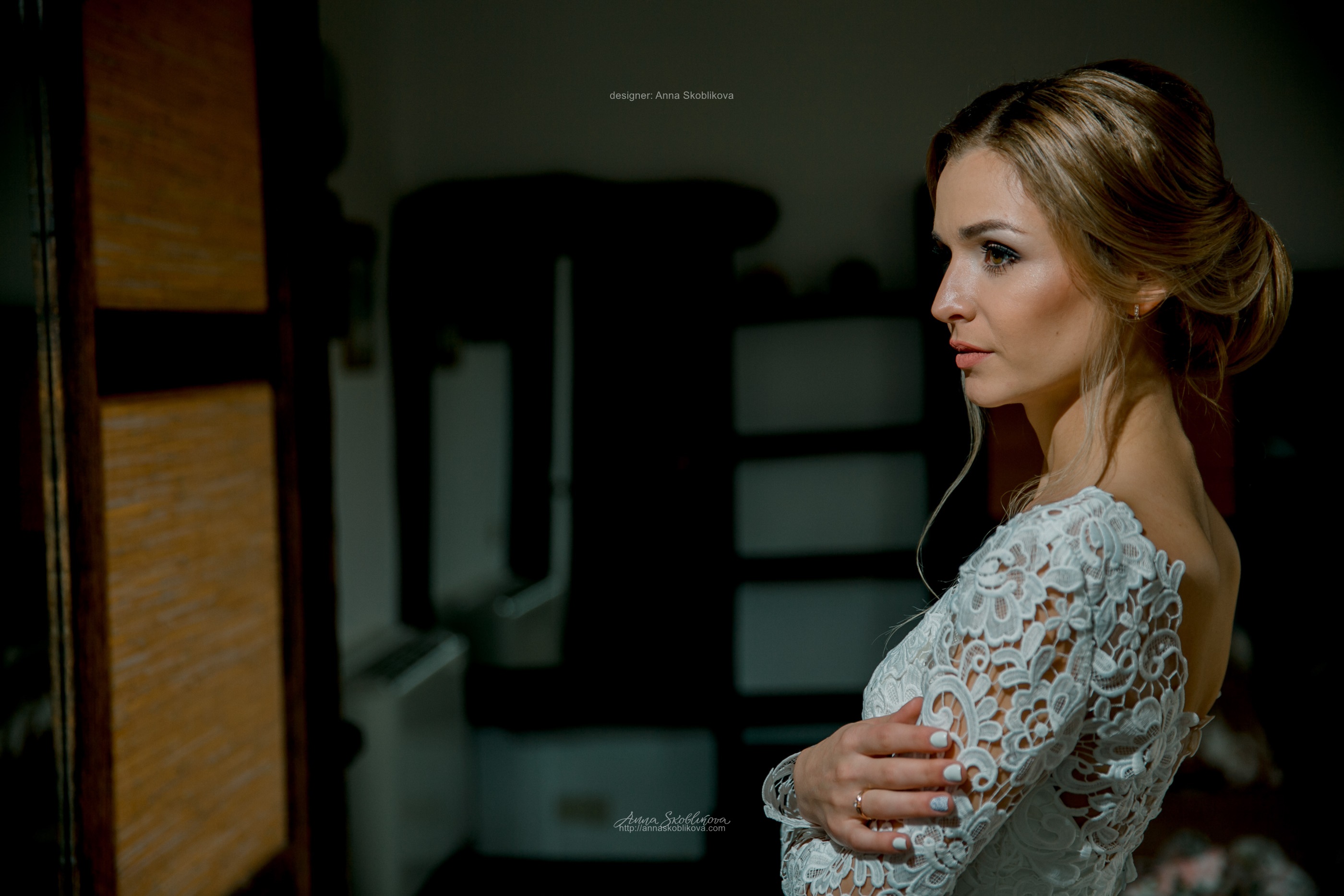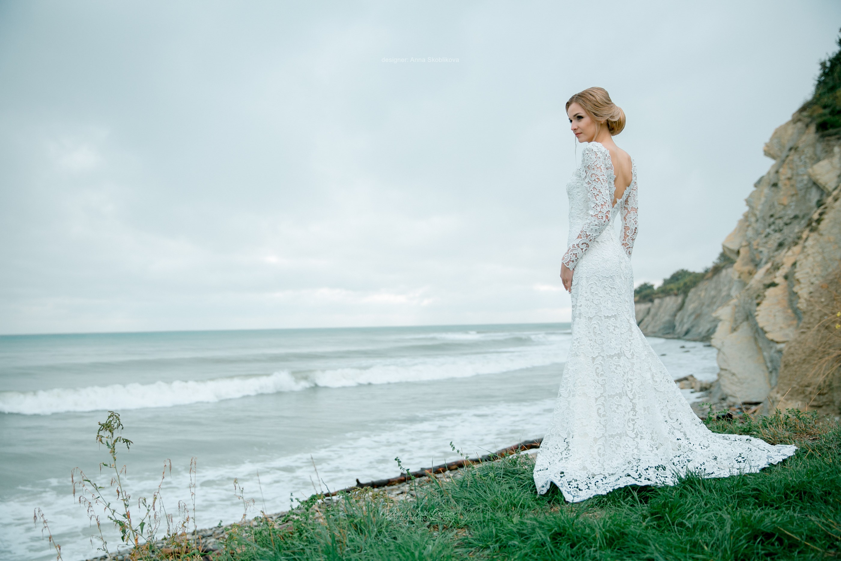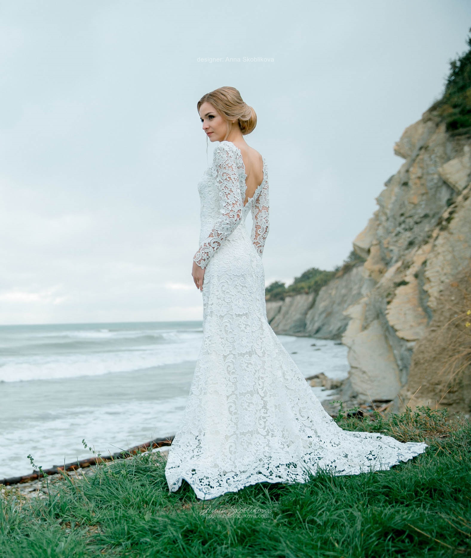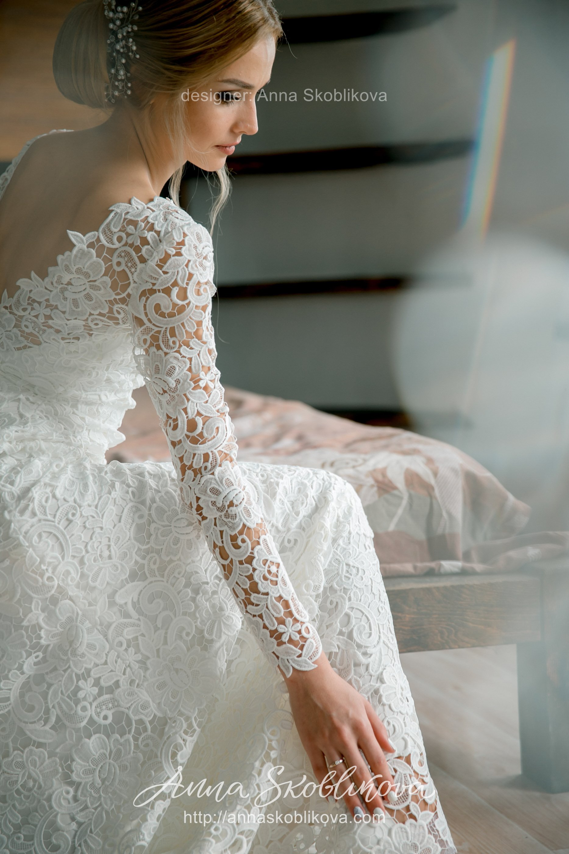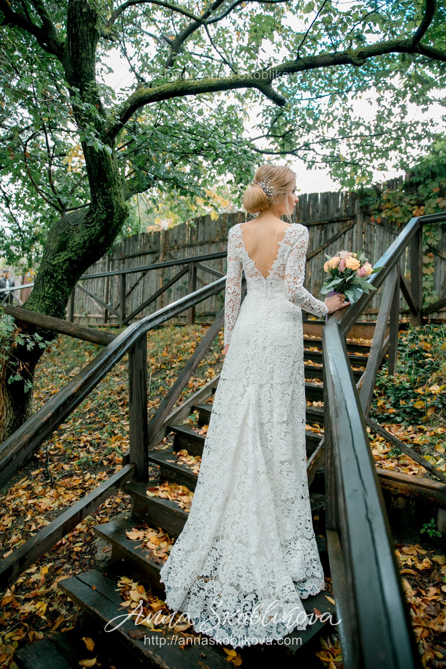 Свадебное платье с V-образным вырезом на спине из роскошного плотного кружева.