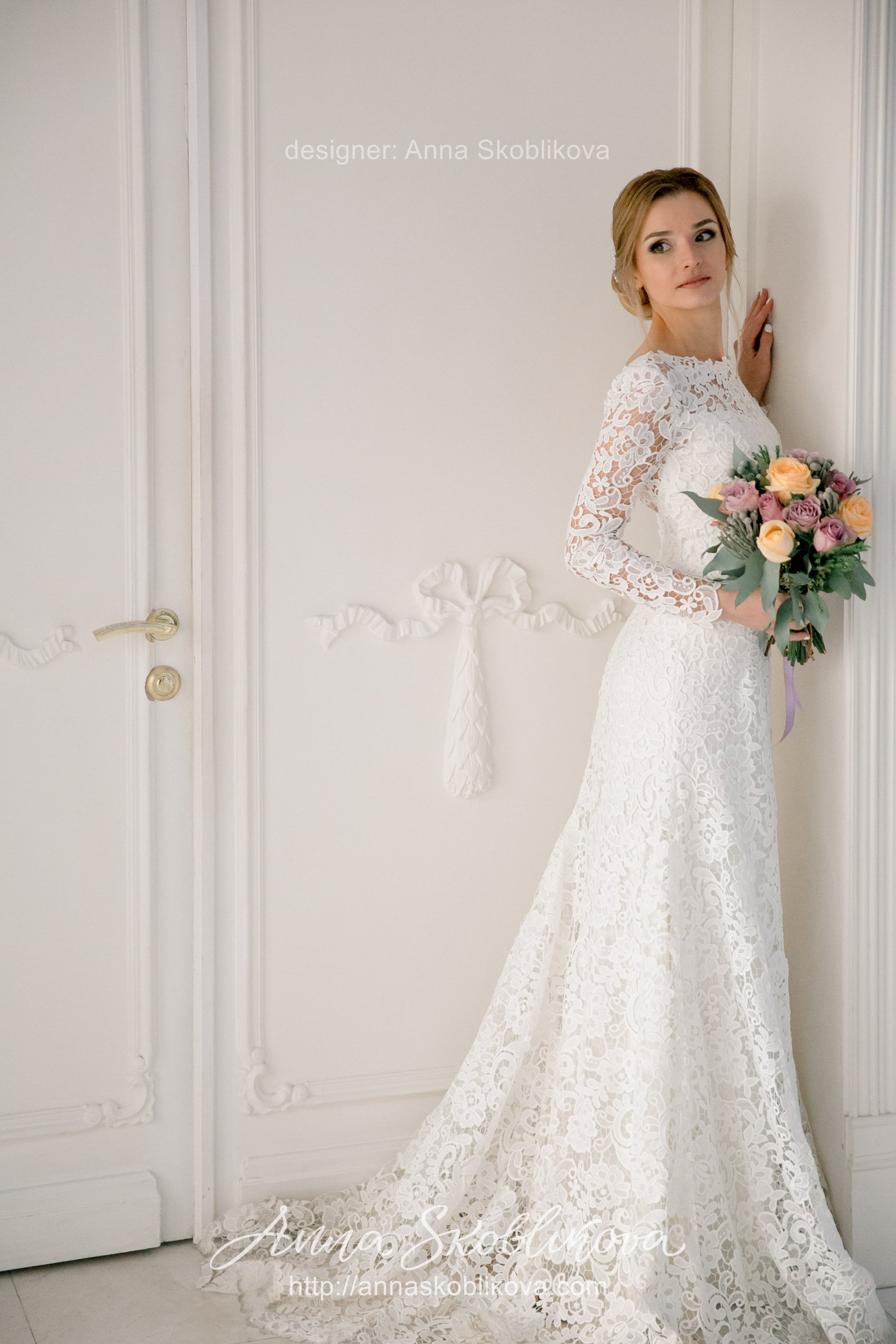 Свадебное платье полу прилегающего силуэта (fit and flare) подчеркивает элегантность и утонченность невесты.