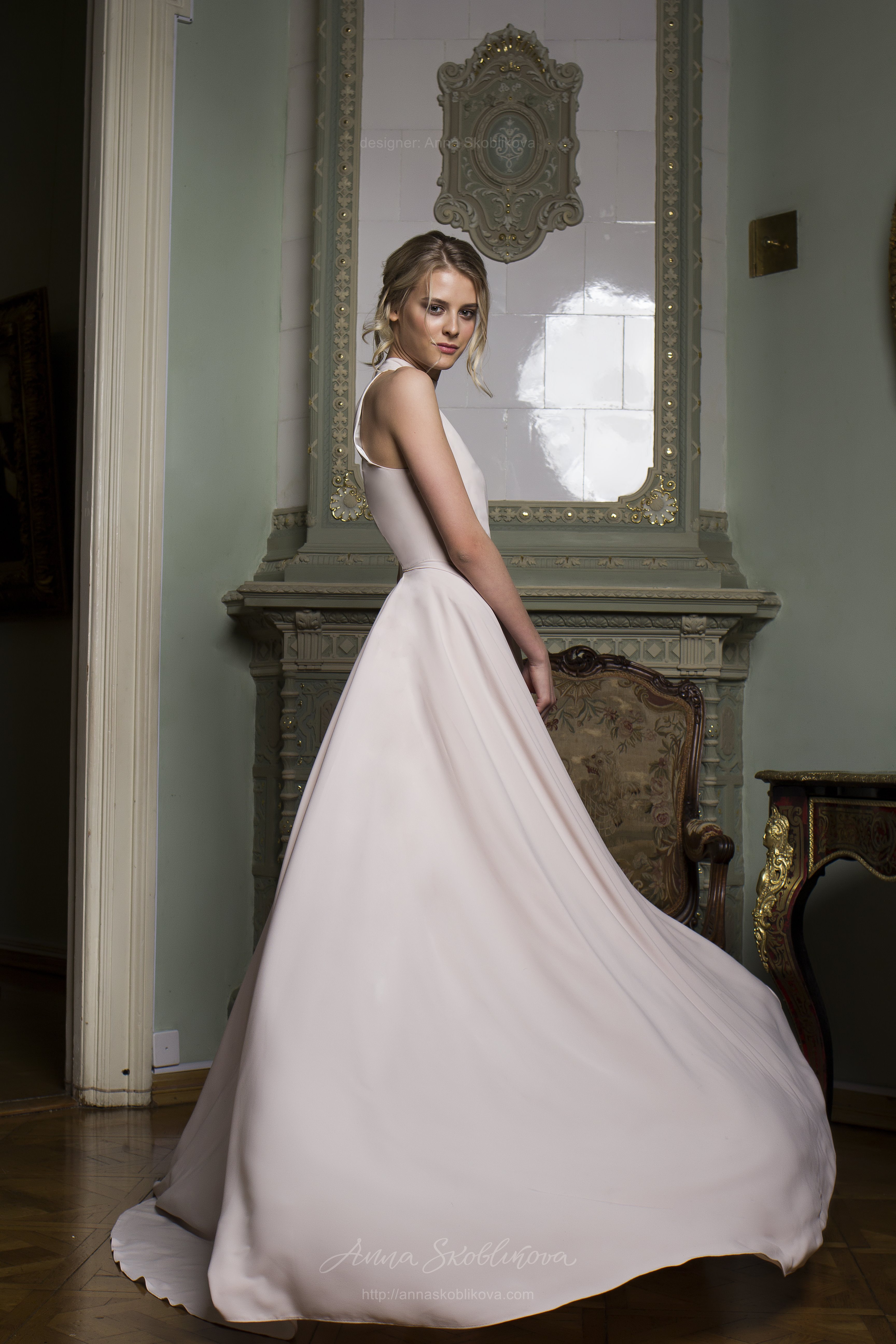 Лиф платья имеет вырез плеч американская пройма (halter) и небольшой воротник стойку. Застежка-молния, в платье сзади, на спине и в горловине.