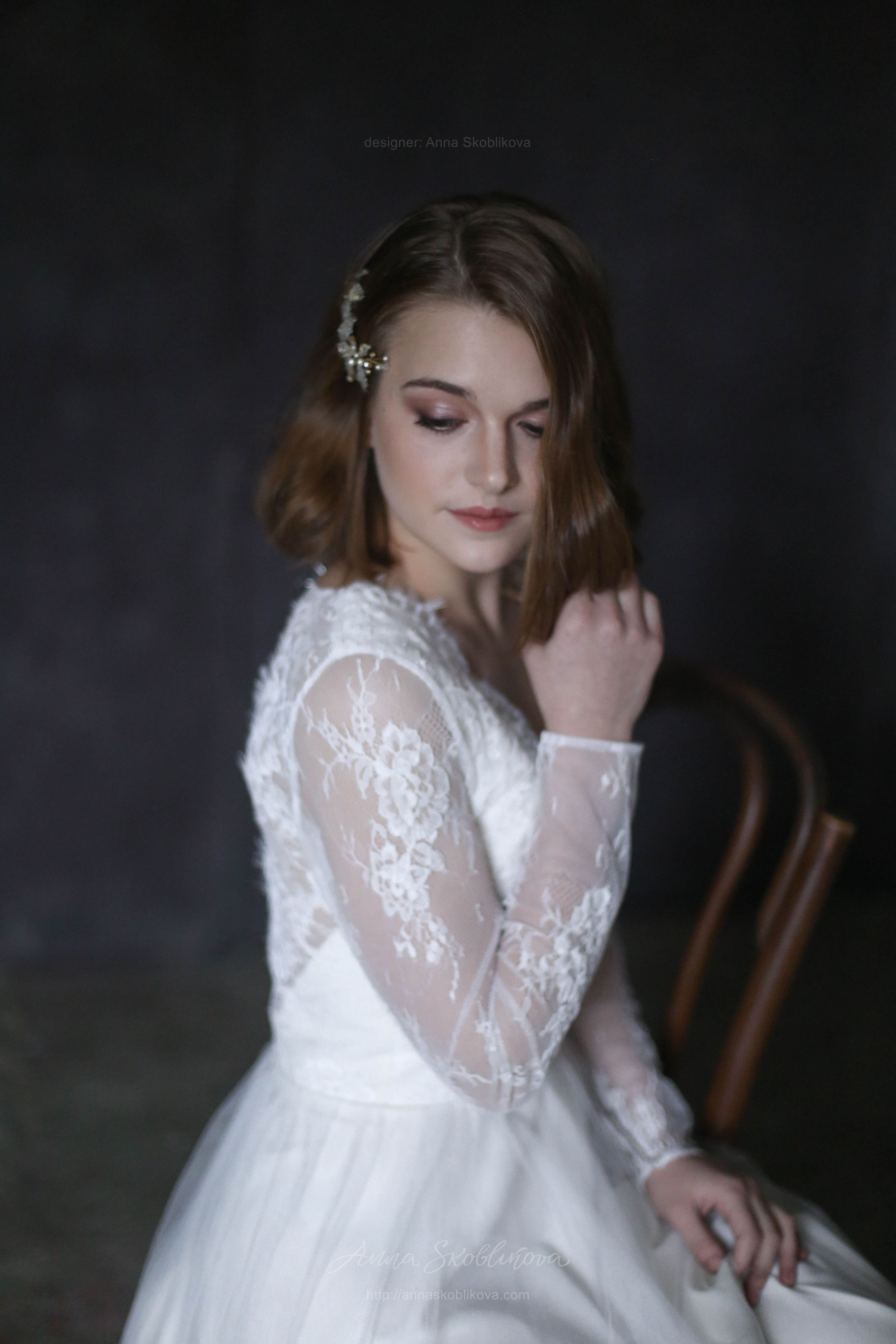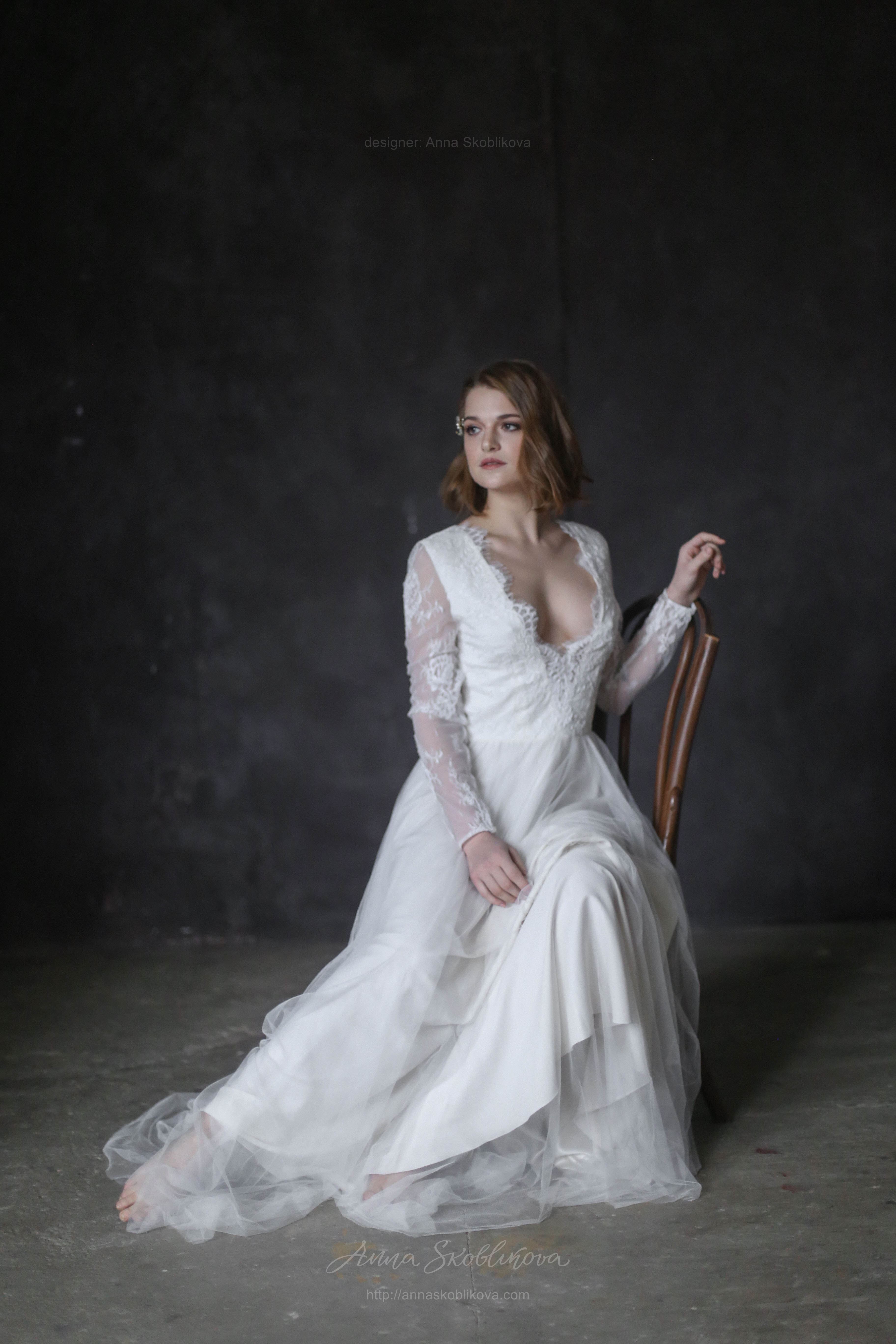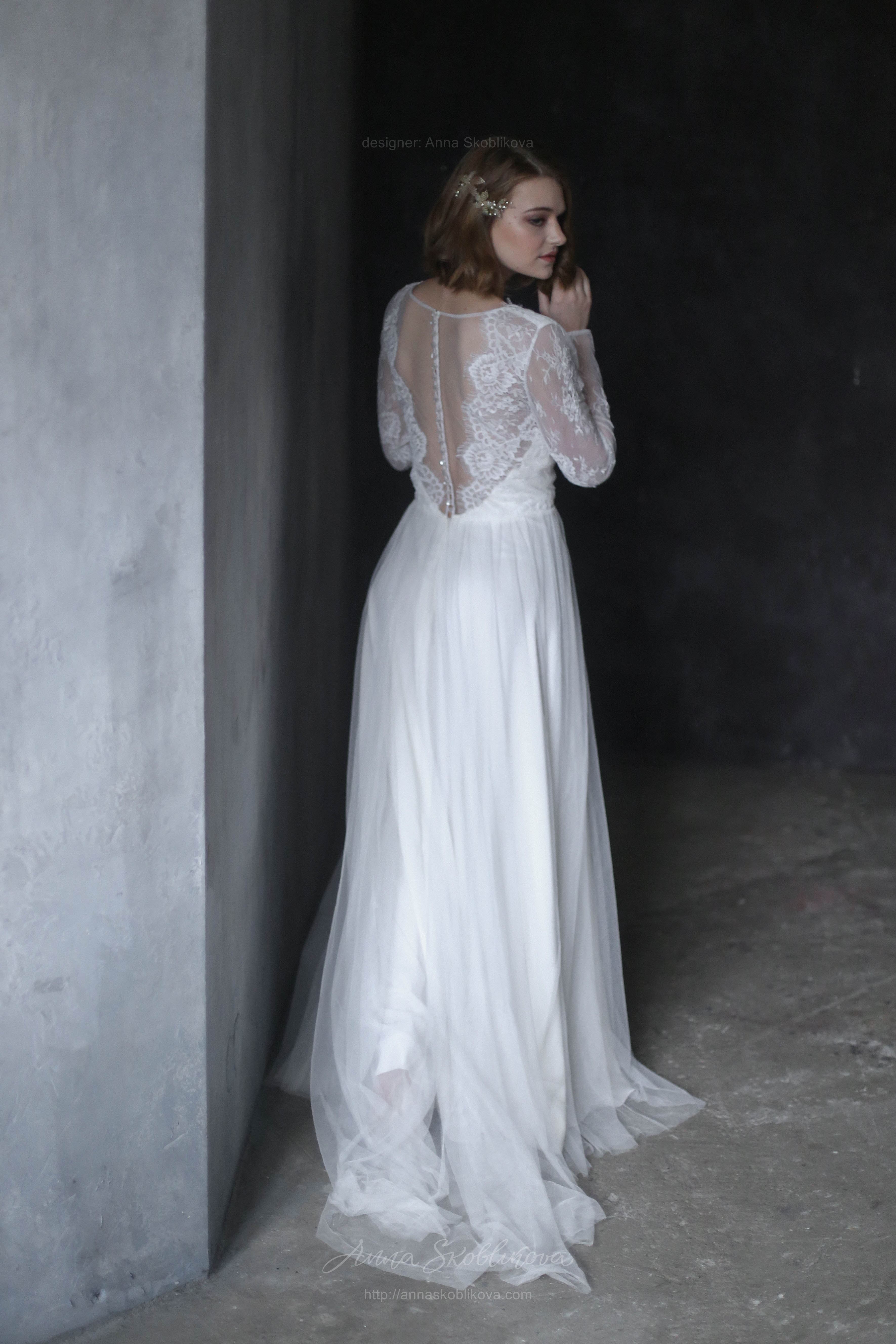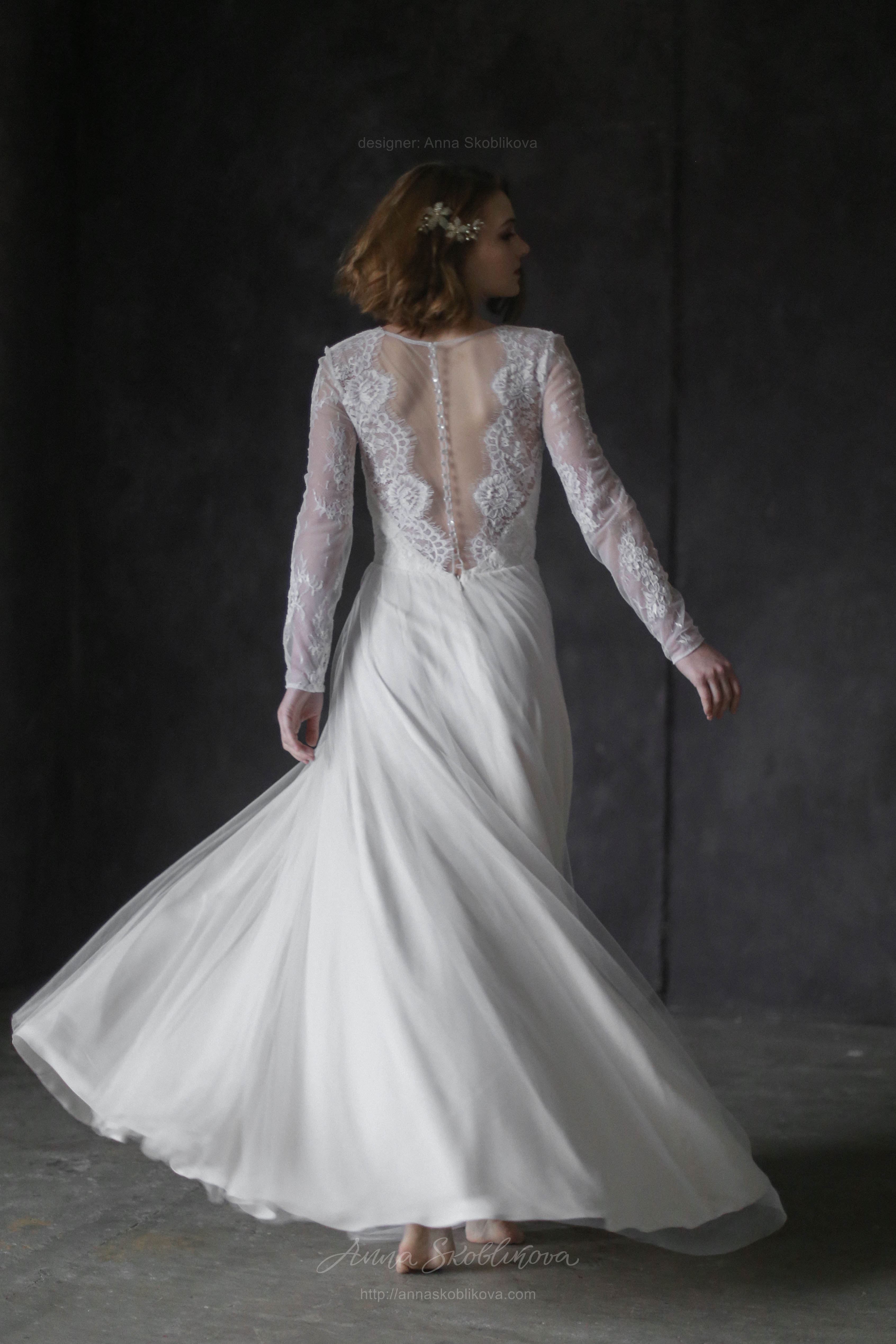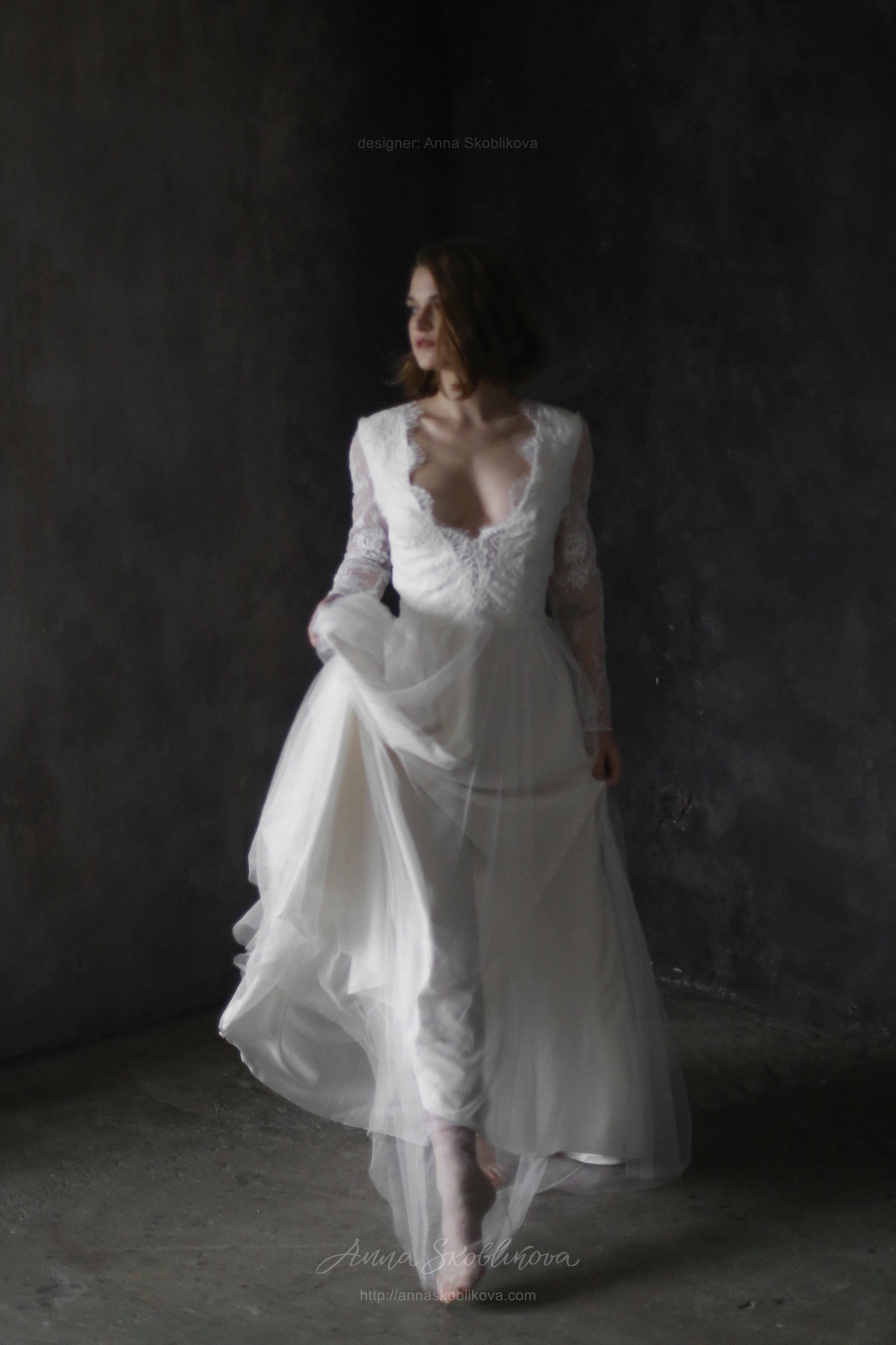 Свадебное платье с кружевным лифом и юбкой из сатина и итальянской сетки Рукав длинный на пуговице, спереди вырез декольте, сзади в-вырез и вставка из сетки. Застежка на пуговицы.