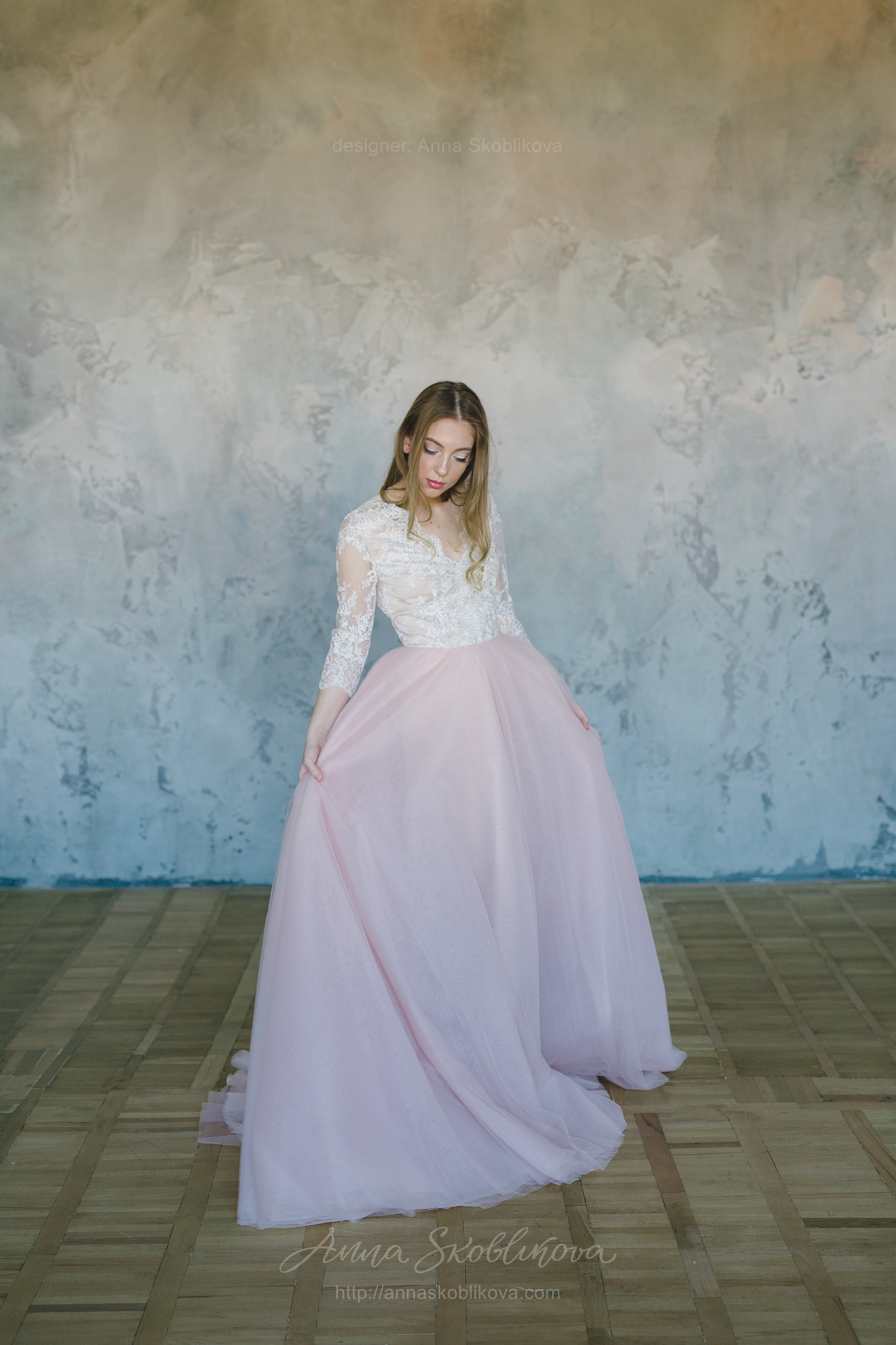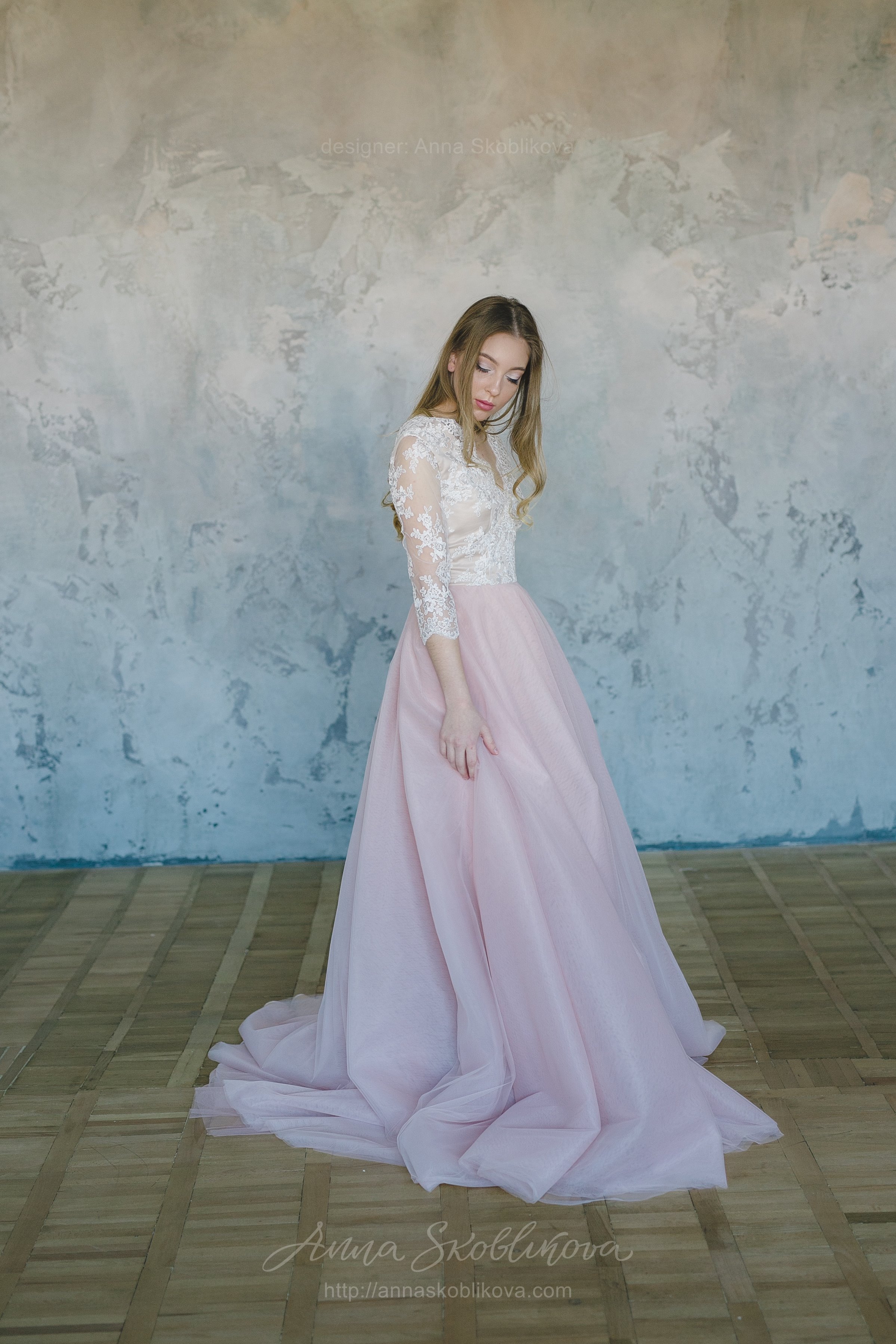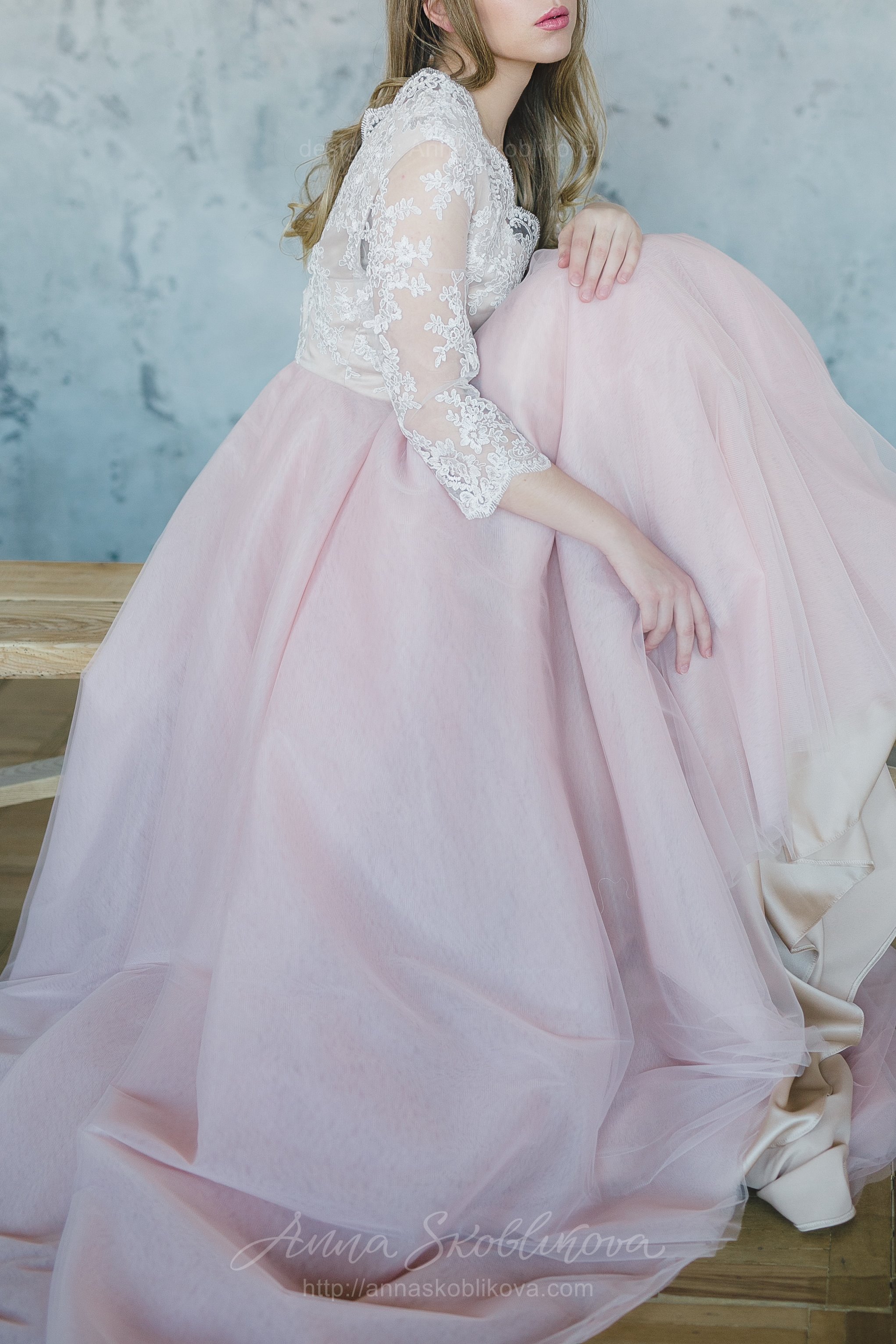 Свадебное платье из пудрового фатина и кружева молочного цвета