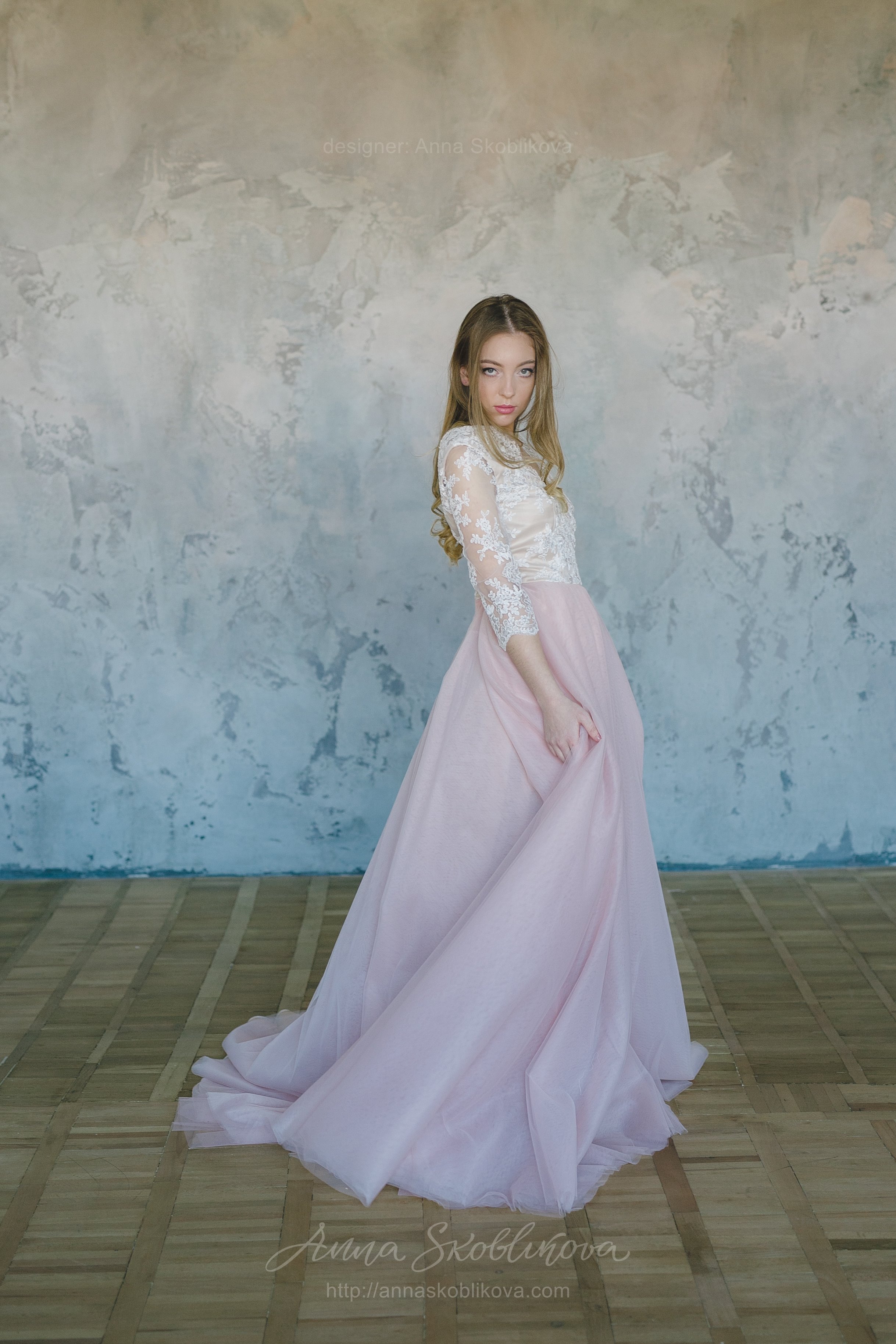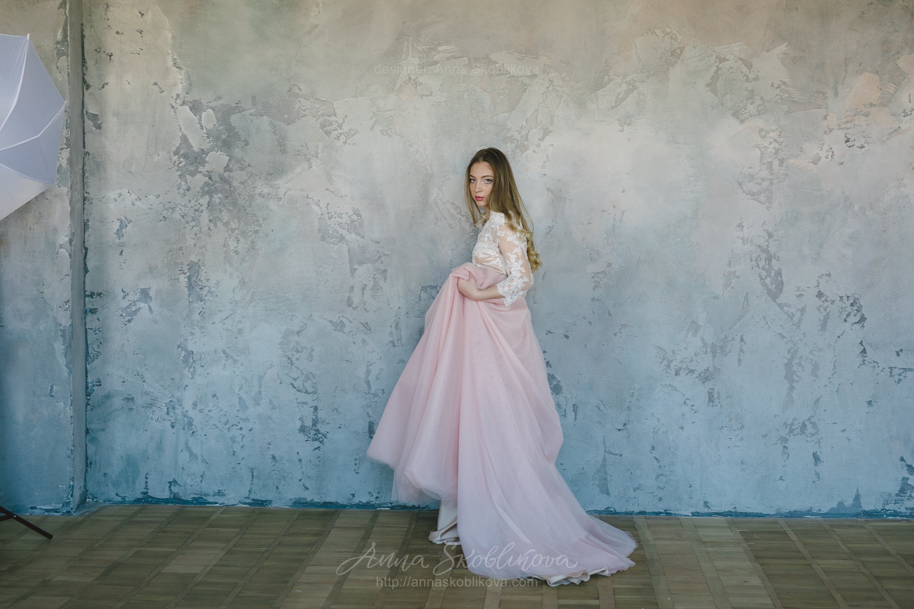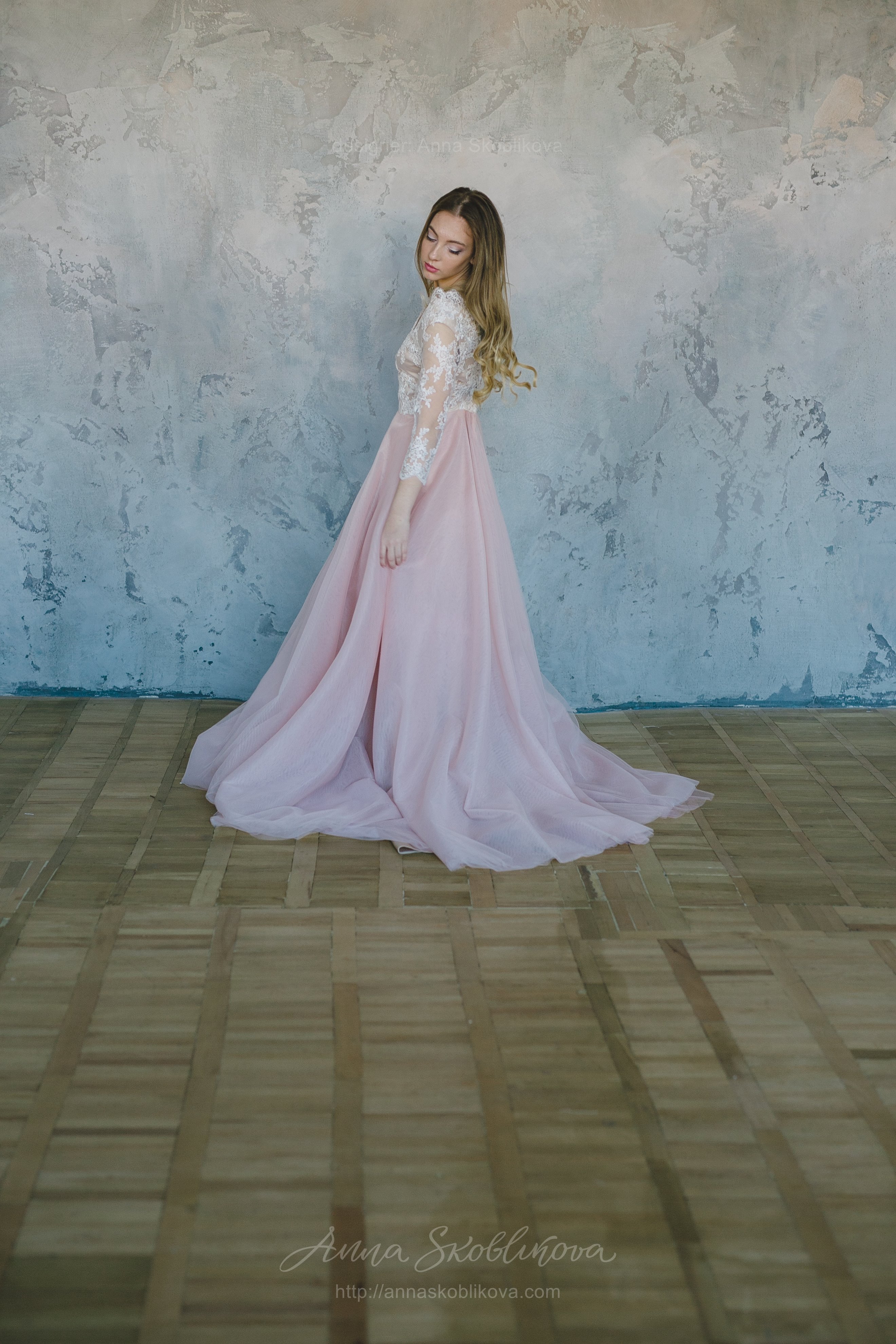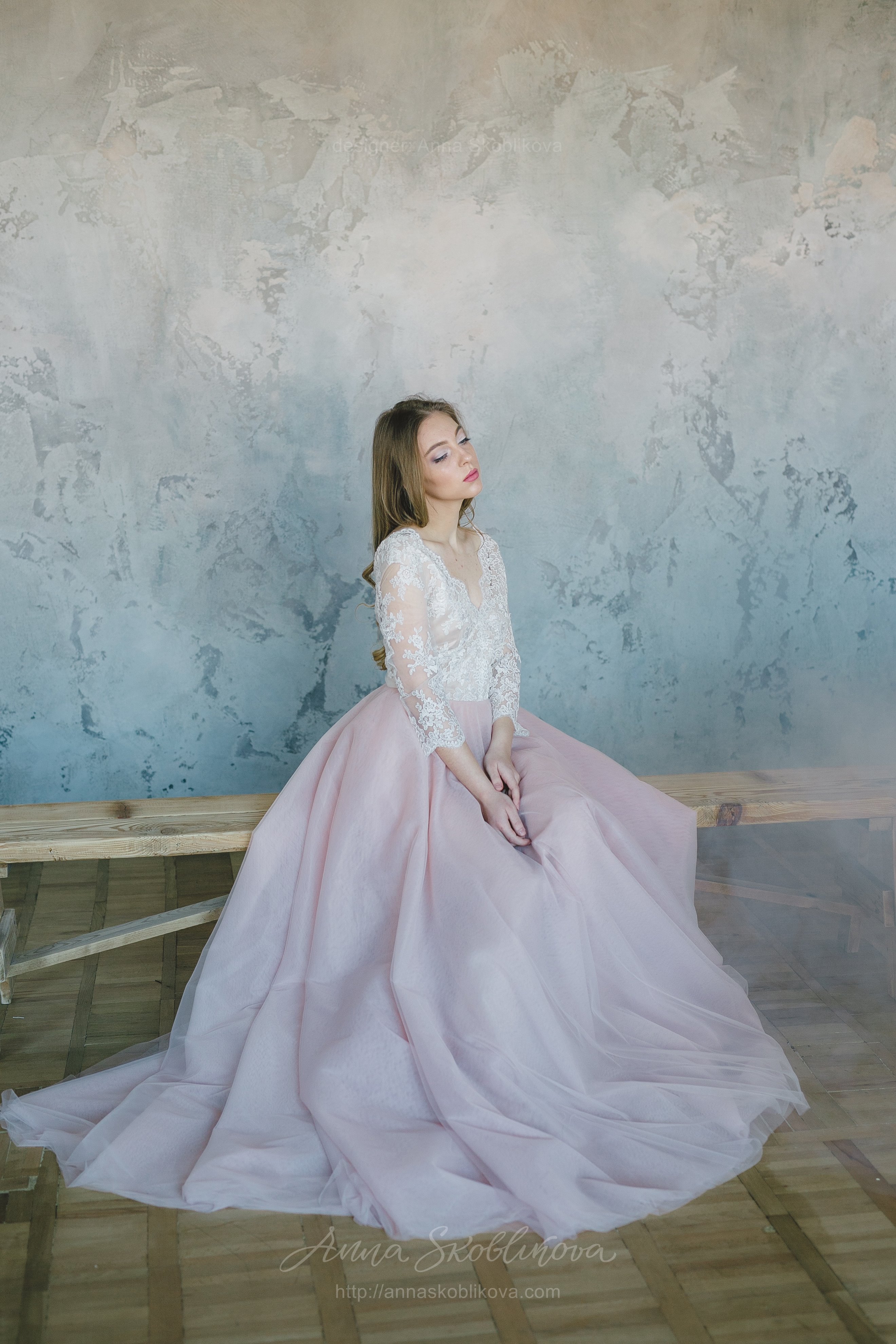 Свадебное платье из пудрового фатина и кружева молочного цвета