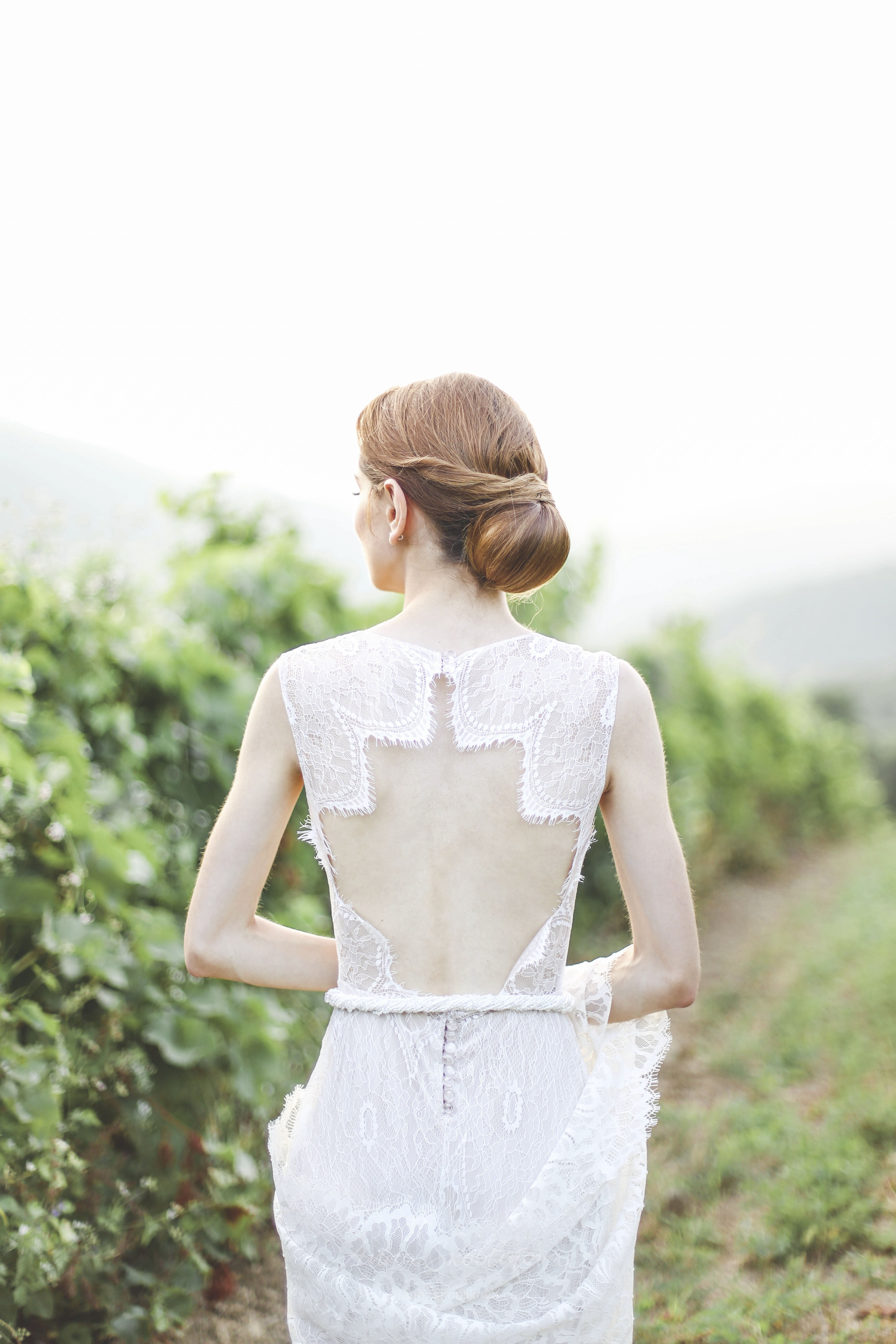 Спинка свадебного платья открыта в форме ромба, красивая застежка на пуговички на  талии и между лопаток украшают платье.
