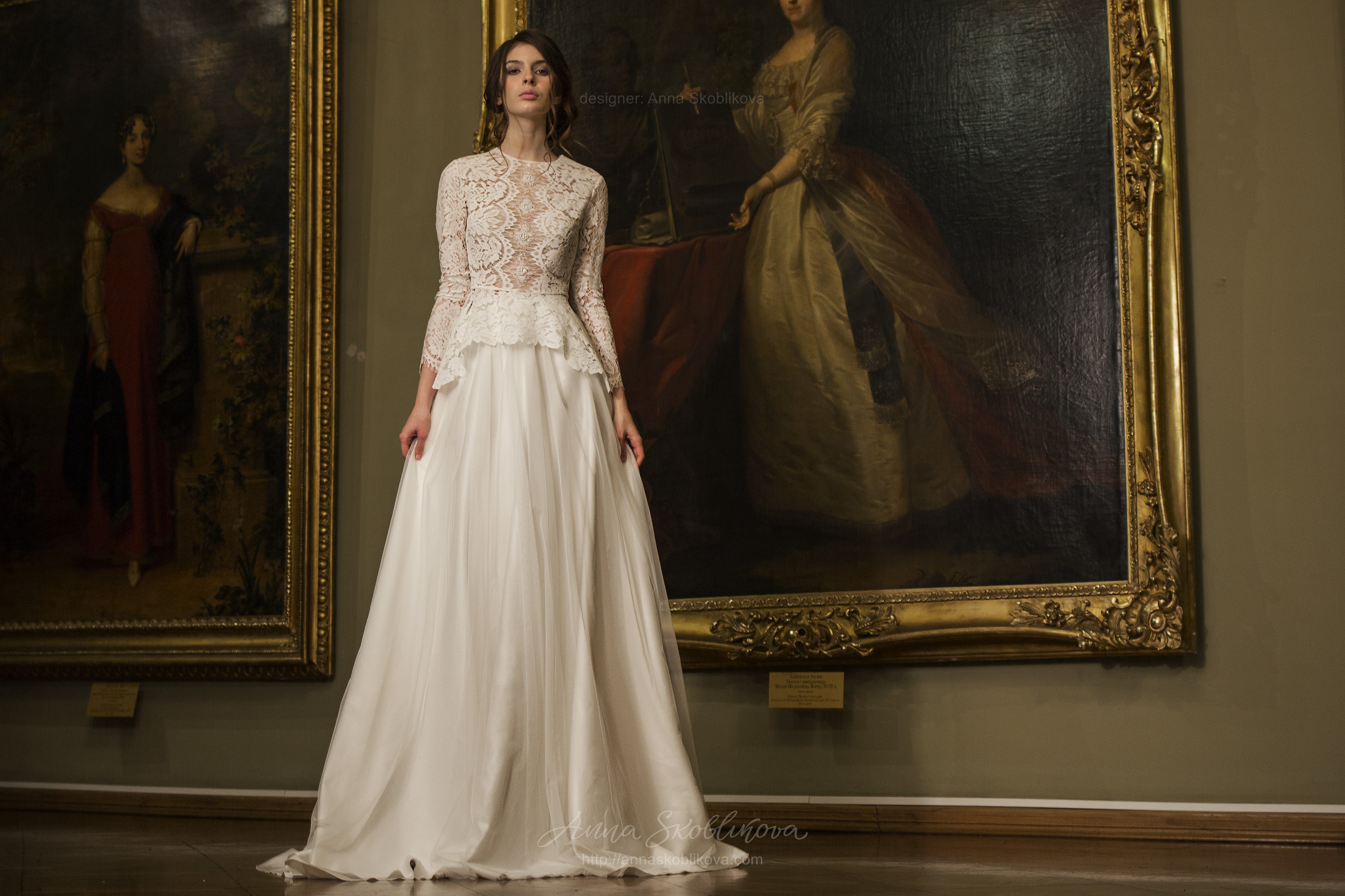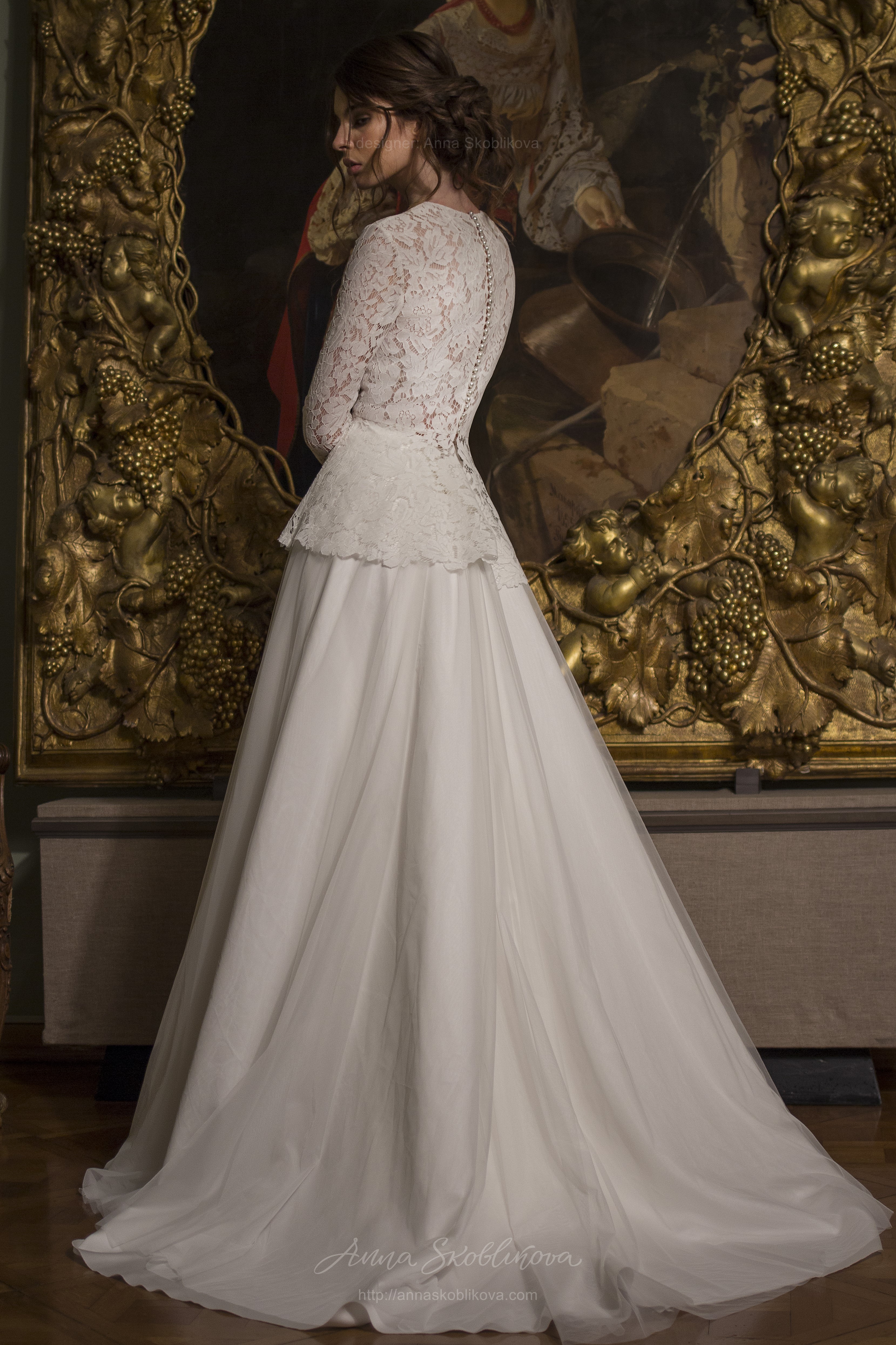 Прилегающая свадебная блузка с узким рукавом и баской выглядит торжественно и скромно.